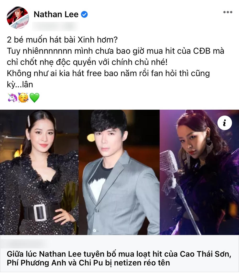 Nathan Lee gợi ý: "Hai bé muốn hát bài Xinh không? Tuy nhiên mình chưa bao giờ mua hit của *** mà chỉ chốt nhẹ độc quyền với chính chủ nhé. Không như ai kia hát free bao năm rồi fan hỏi thì cũng kỳ".