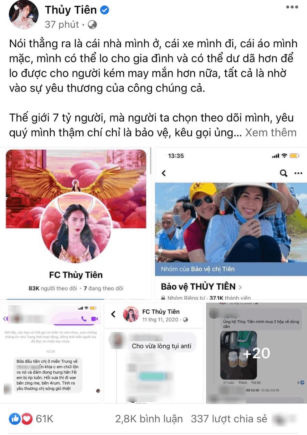 Chiều 22/5, Thủy Tiên đăng tải một bài viết khá dài kèm theo nhiều hình ảnh về sự ủng hộ nhiệt tình từ khán giả dài trên trang cá nhân. Tại đây, cô chia sẻ nhiều điều đáng chú ý về mối quan hệ giữa khán giả và nghệ sĩ. Trong đó, bà xã của cầu thủ Công Vinh đã khẳng định sức ảnh hưởng to lớn của công chúng và lòng biết ơn của mình.