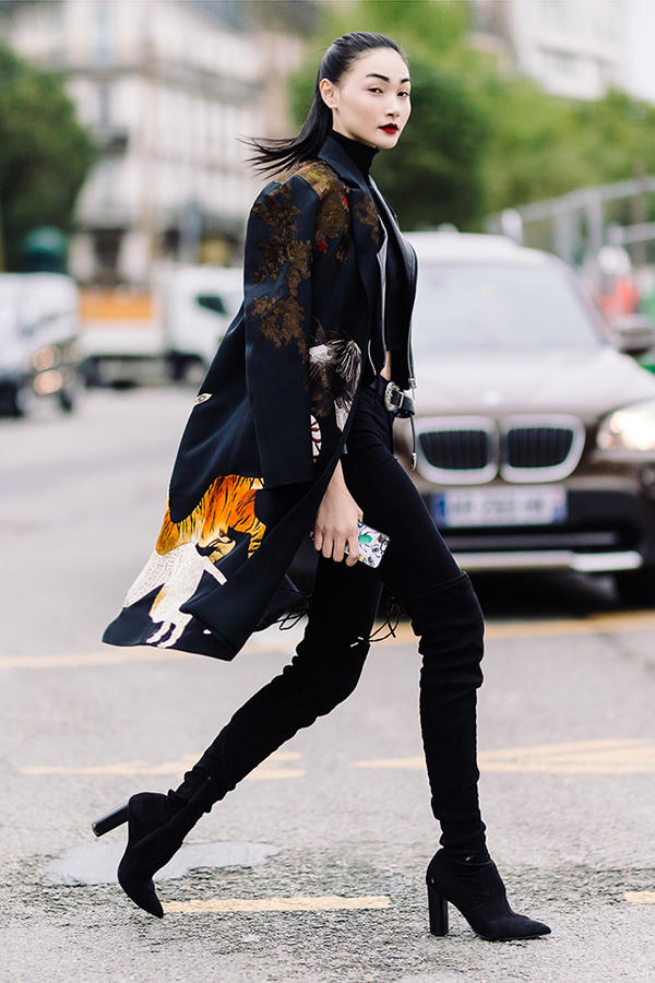 Trong bộ trang phục với phong cách all black (đen toàn tập), Thùy Trang đã khôn khéo làm nổi bật cả set đồ với áo khoác dạ ngoài thêu hoạ tiết thủ công bằng tay. Hoạ tiết gợi lên trong trí tưởng tượng của chúng ta những câu chuyện cổ tích về sự mạnh mẽ của muông loài trong việc chiến đấu, giữ gìn sự sinh tồn.