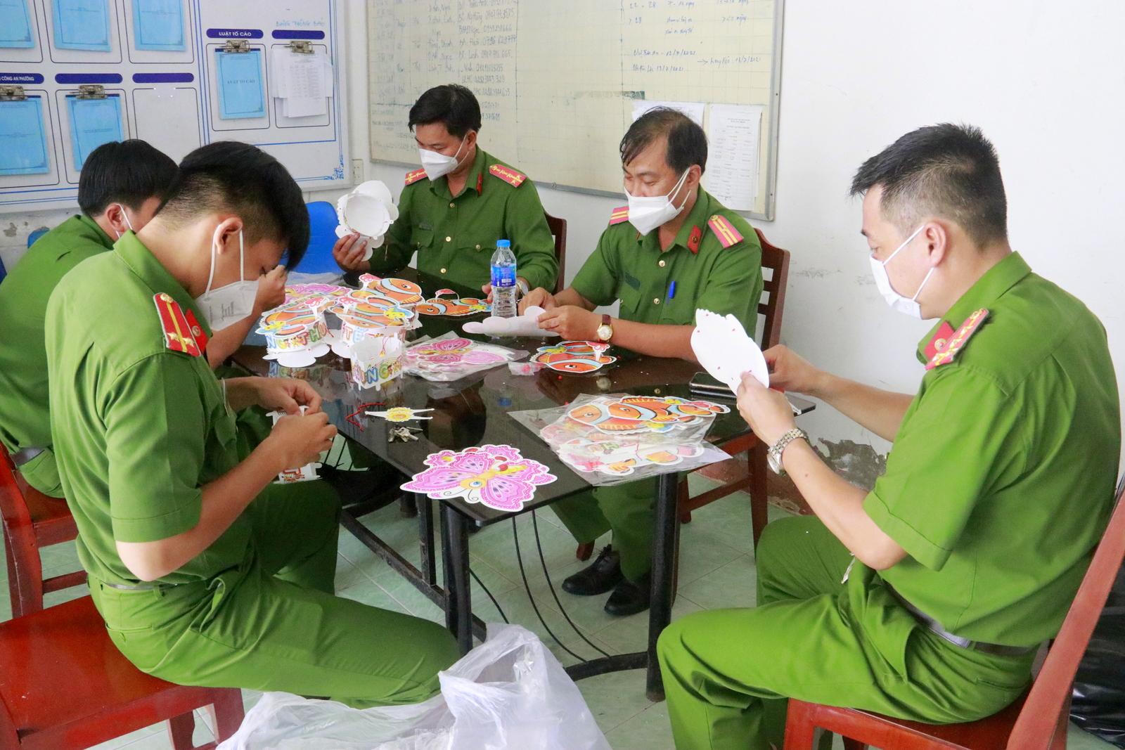 Các chiến sĩ công an tranh thủ giờ nghỉ trưa xếp lồng đèn chuẩn bị Trung thu cho các em |
