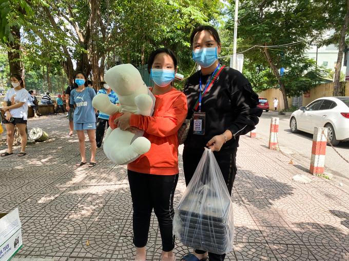Chị Cao Thị Phương cùng con gái Ngọc Diệp xuống nhận bảy suất cơm miễn phí cho cả phòng vào trưa 4/11. Ảnh: Quỳnh Nguyễn