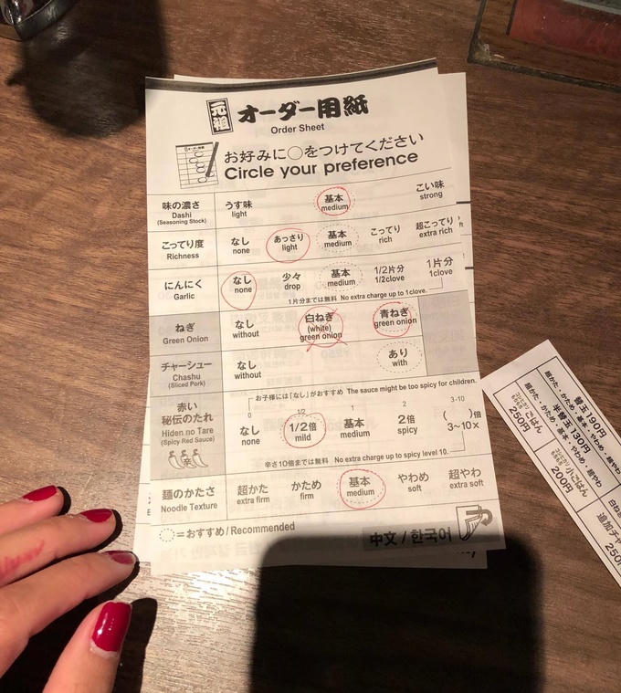 Máy nhả ra một mảnh giấy nhỏ, khách khoanh tròn vào những ô trên in sẵn giấy, chọn các loại gia vị tùy ý hay topping ăn kèm rồi đưa cho nhân viên phục vụ.