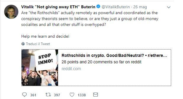 Năm 2018, trong một lần chia sẻ trên Russia Today, ông Vitalik Buterin - nhà sáng lập Ethereum (đồng tiền ảo phổ biến thứ nhì thế giới) tự hỏi liệu thuyết âm mưu về dòng họ hùng mạnh ngành ngân hàng có mở rộng đến cả lĩnh vực tiền mã hóa hay không: “Liệu những người nhà Rothschild có phối hợp đủ với nhau để được xem là một nhóm trong thời đại ngày nay?”. Nhà sáng lập Ethereum nêu ra vấn đề trên khi những người ủng hộ tiền mã hóa đang thảo luận về dự án blockchain IMMO vốn được nhà Rothschild rót vốn.