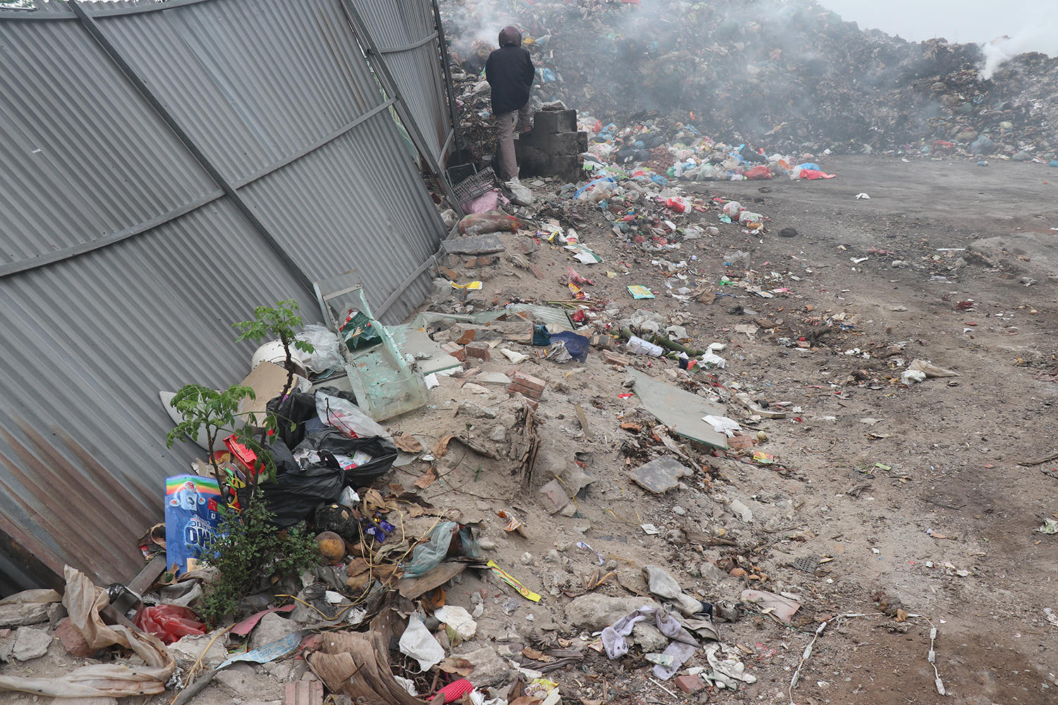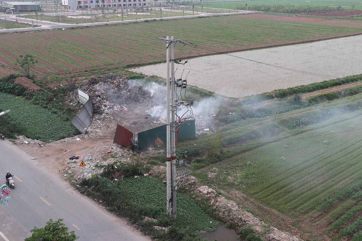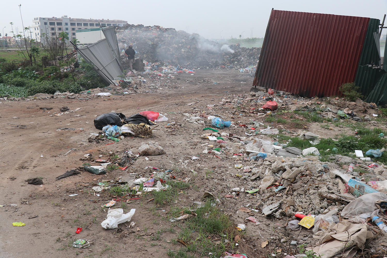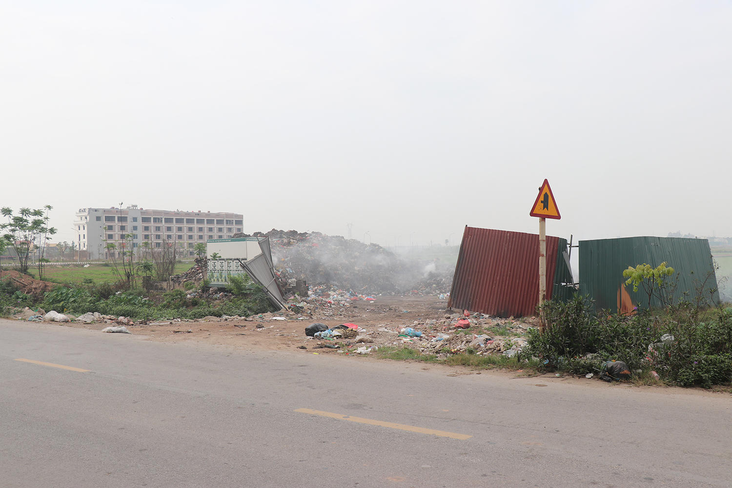 Điểm tập kết rác nằm cạnh đường tỉnh lộ 287. Đây là tuyến đường có lưu lượng người và phương tiện lưu thông lớn. Bãi rác chỉ được che chắn tạm bợ bằng vài tấm tôn ở góc, còn lại bỏ trống.