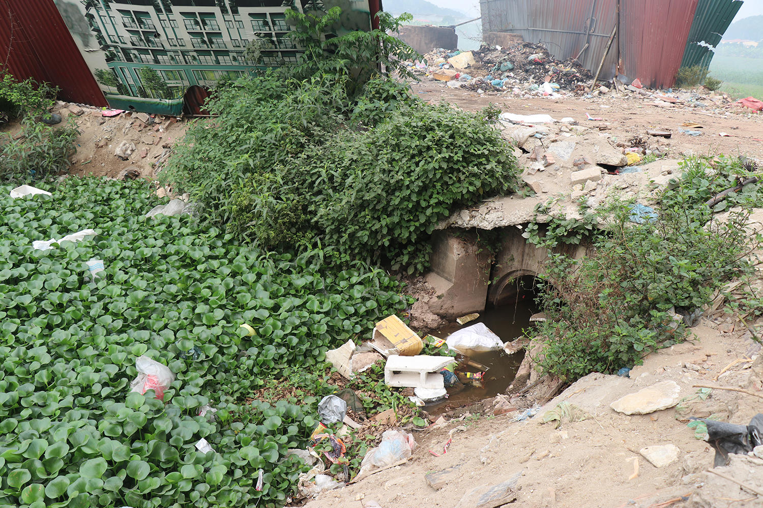 Rác thải vương vãi xuống mương, có nguy cơ gây ô nhiễm nguồn nước. Ông T. cho biết, người dân nơi đây đã nhiều lần phản ánh tới chính quyền địa phương, thậm chí gửi đơn phản ánh, đơn kêu cứu tới các cơ quan ban, ngành nhưng cho đến nay tình trạng ô nhiễm từ bãi tập kết rác này vẫn không được giải quyết.