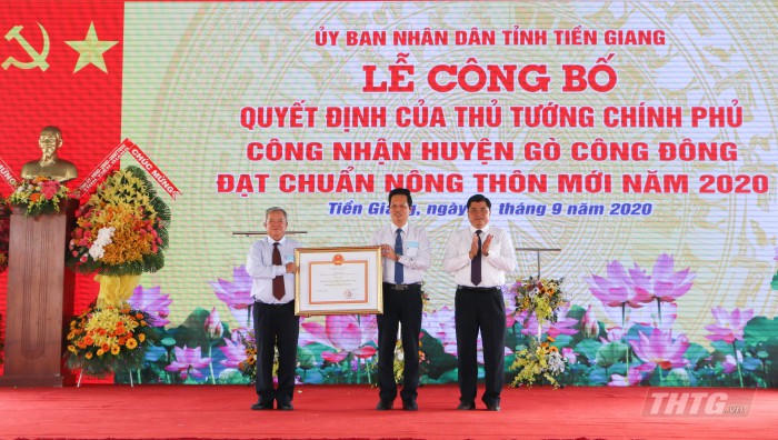 (PLVN) - Ngày 01/09/2020, UBND tỉnh Tiền Giang tổ chức lễ công bố Quyết định số 1215/QĐ-TTg của Thủ tướng Chính phủ ban hành ngày 11/08/2020 về việc Công nhận huyện Gò Công Đông, tỉnh Tiền Giang đạt chuẩn nông thôn mới năm 2020.