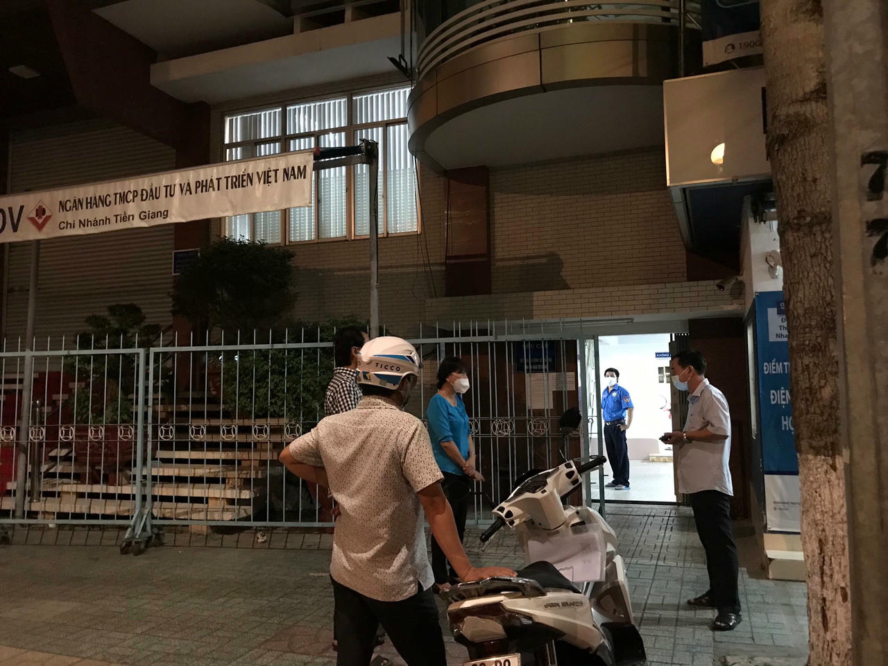 Bà Lê Thị Bé Phượng trao đổi với lãnh đạo Ngân hàng BIDV chi nhánh Tiền Giang về việc khử khuẩn và phong tỏa ngân hàng theo quy định. |