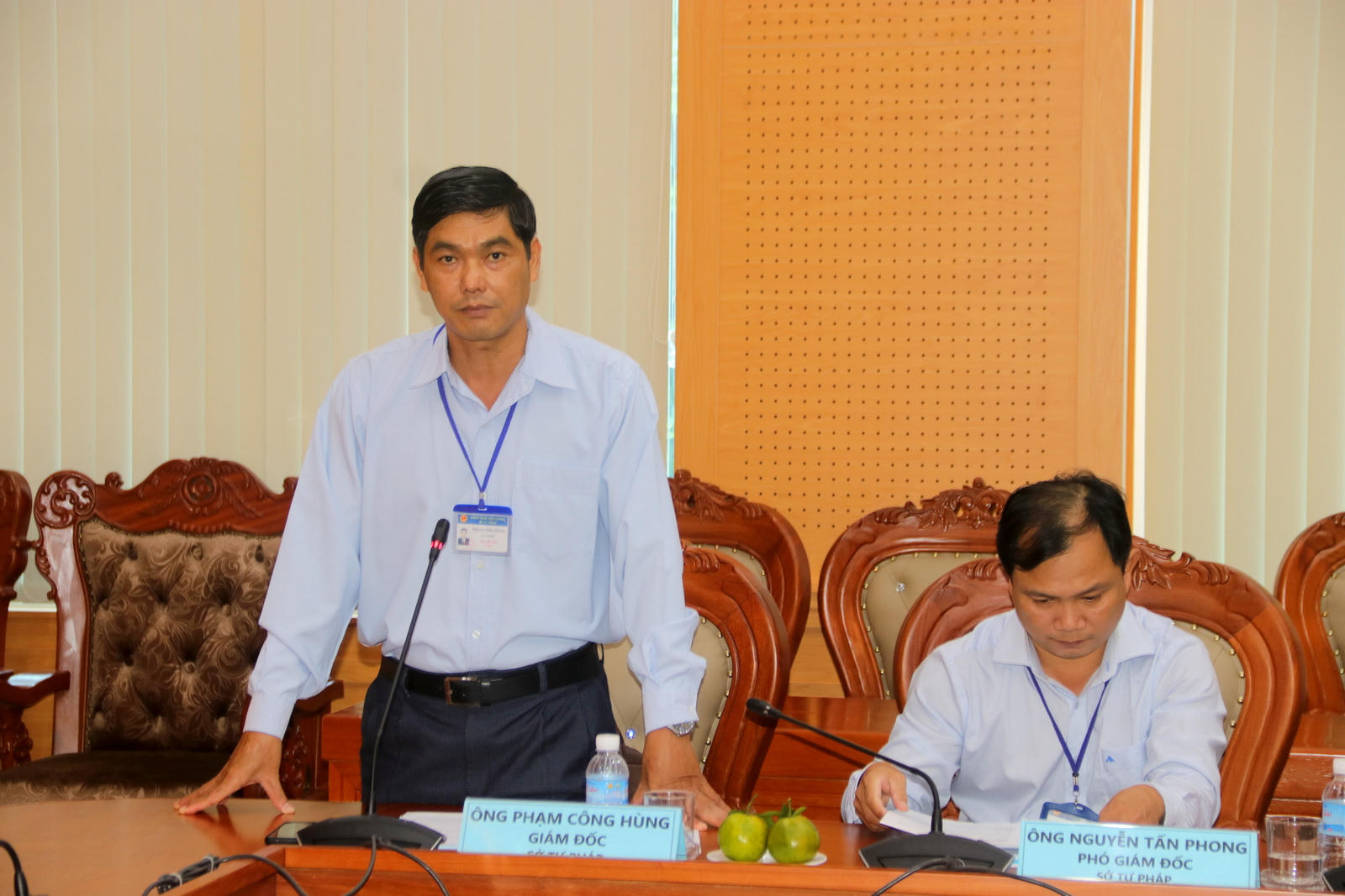 Ông Phạm Công Hùng – Giám đốc Sở Tư pháp tỉnh Tiền Giang báo cáo với đoàn công tác |