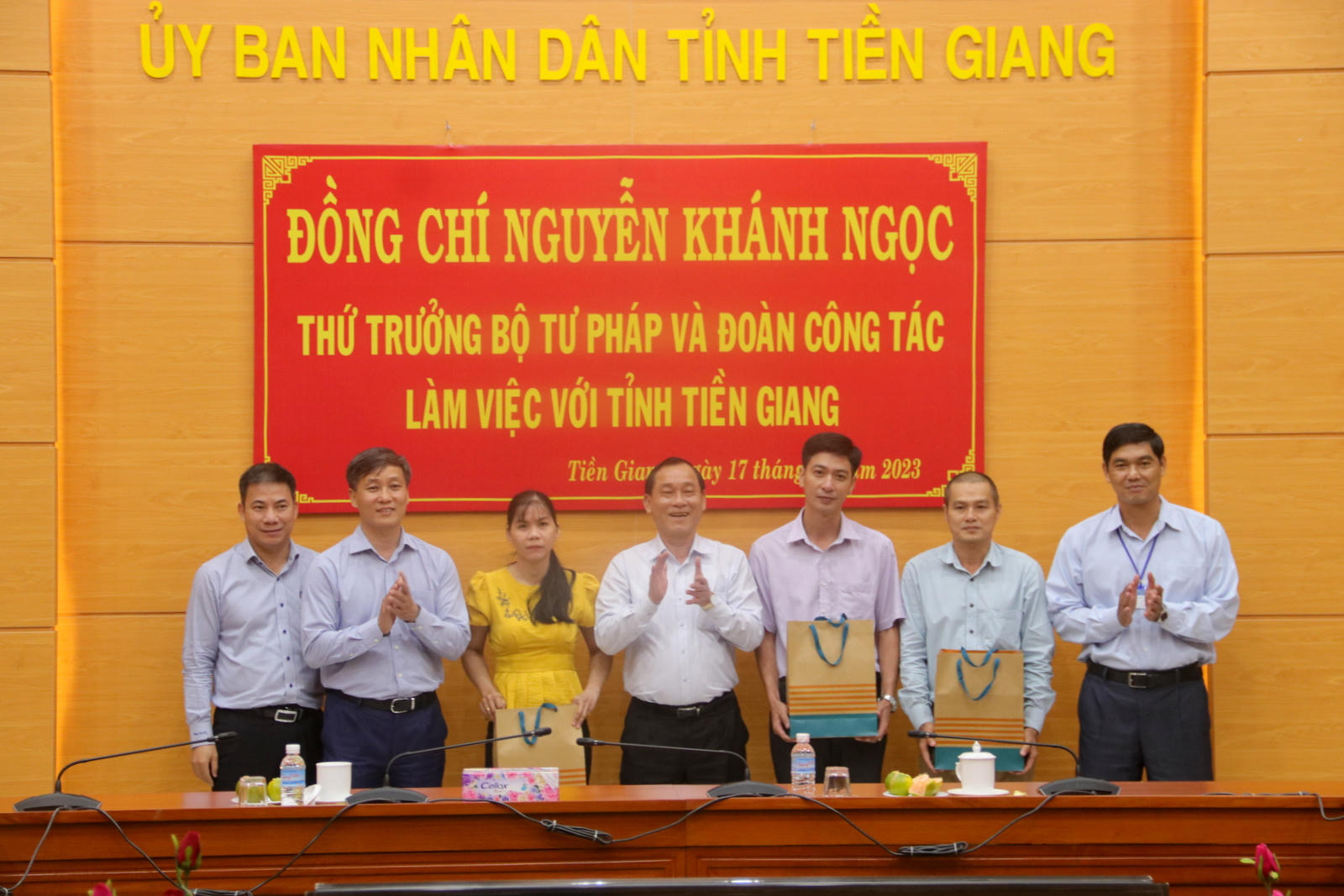 Tiếp và làm việc với đoàn có ông Nguyễn Văn Vĩnh – Phó Bí thư tỉnh ủy, Chủ tịch UBND tỉnh Tiền Giang; ông Phạm Công Hùng – Giám đốc Sở Tư pháp; cùng lãnh đạo các Sở, ban, ngành thuộc tỉnh Tiền Giang.