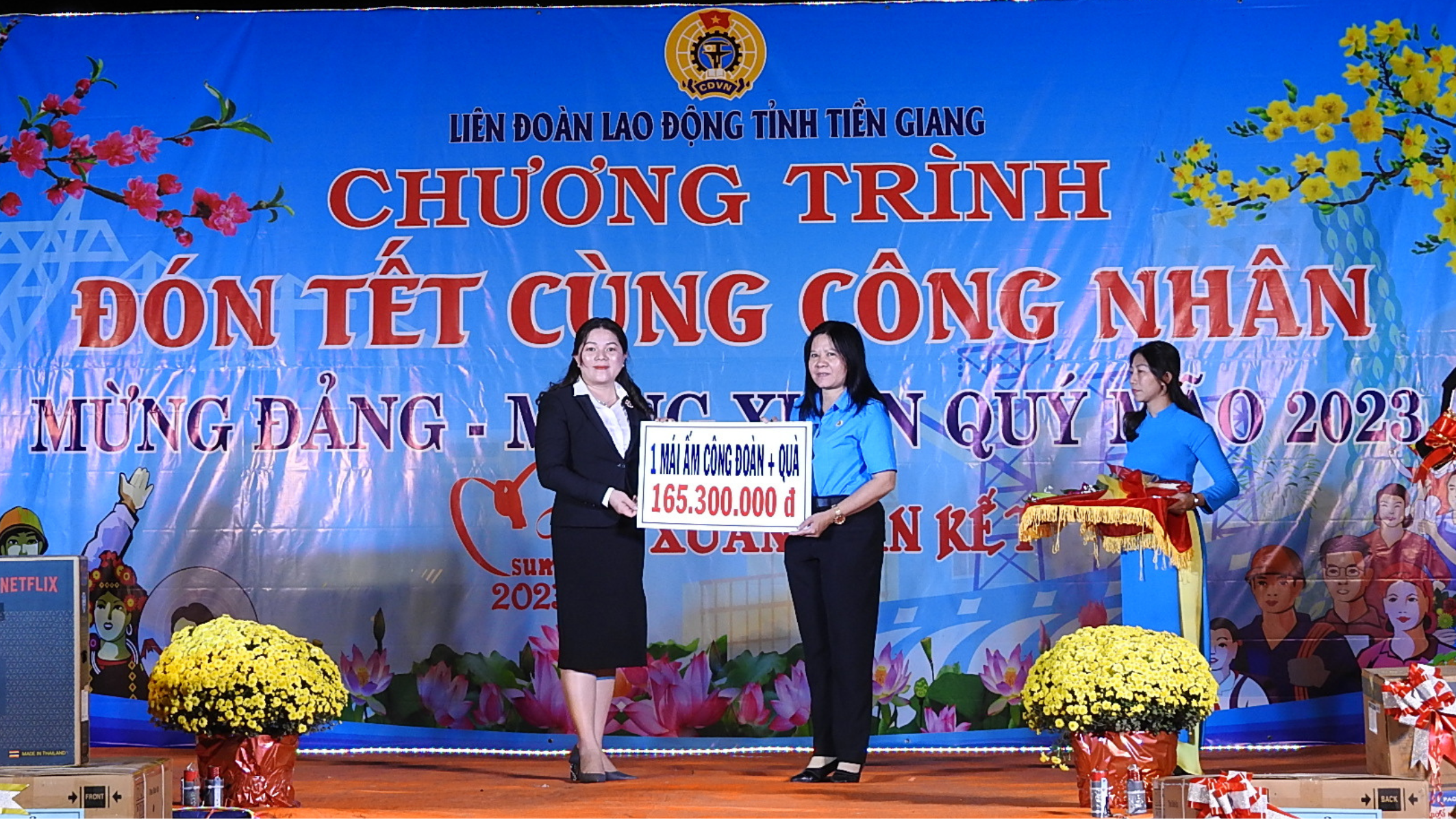 Dịp này, LĐLĐ tỉnh Tiền Giang đã phối hợp cùng các doanh nghiệp trao nhiều phần quà Tết và tặng quà “Mái ấm Công đoàn” cùng trợ cấp cho những công nhân, lao động gặp khó khăn. Chương trình còn tổ chức rút thăm trúng thưởng với những phần quà có giá trị và tổ chức biểu diễn văn nghệ phục vụ người lao động.