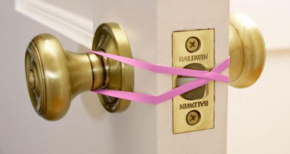 Hãy dùng một sợi dây chun vắt chéo và móc vào hai tai nắm cửa, bạn sẽ giữ được cánh cửa luôn mở. |