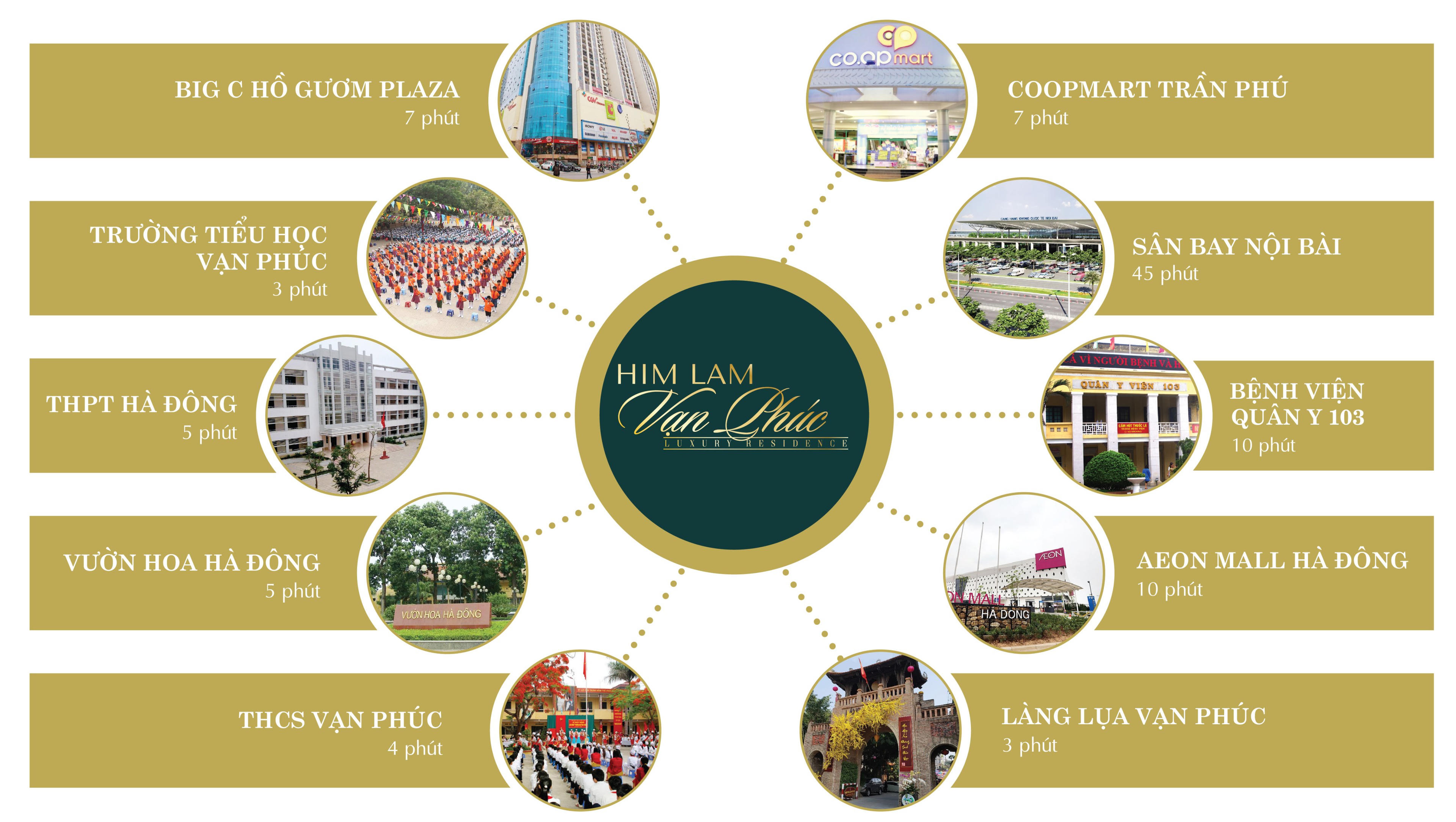 Không chỉ sở hữu các tiện ích nội khu sáng giá, Him Lam Vạn Phúc còn thừa hưởng hệ thống các tiện ích ngoại khu cao cấp và đồng bộ. Từ Him Lam Vạn Phúc, cư dân rất thuận tiện khi kết nối với các tiện ích hàng đầu của quận Hà Đông như: Siêu thị Co.opMart Trần Phú, Metro Hà Đông, Aeon Mall Hà Đông, BigC Hồ Gươm Plaza, Bưu điện Hà Đông, chợ Hà Đông, Trung tâm Thể dục thể thao; vườn hoa, làng nghề truyền thống Lụa Hà Đông, …