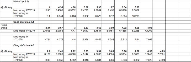 Đồng thời, bảng lương của cán bộ, công chức, viên chức sẽ có sự tăng trưởng đáng kể. Cụ thể với nhóm công chức loại A như sau: