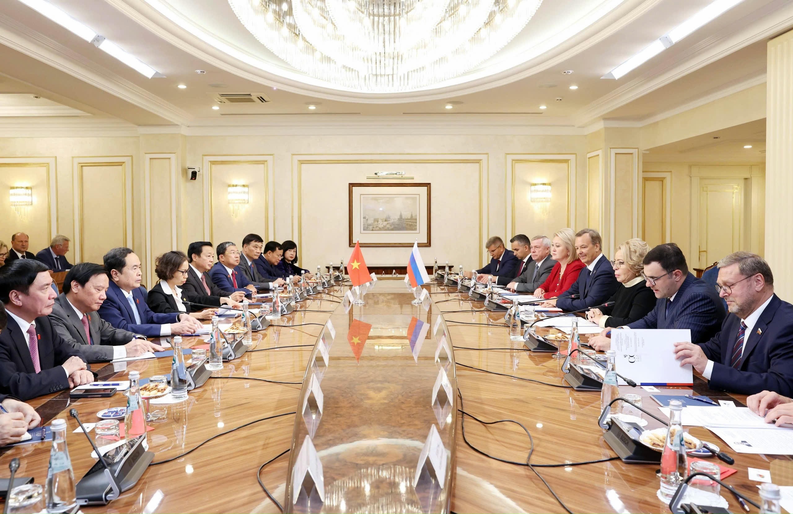 (PLVN) - Chủ tịch Quốc hội Trần Thanh Mẫn và Chủ tịch Hội đồng Liên bang Valentina Ivanovna Matvienko đánh giá cao thành quả đạt được sau 30 năm ký kết Hiệp ước về những nguyên tắc cơ bản của quan hệ hữu nghị Việt - Nga; hơn 10 năm thiết lập quan hệ Đối tác chiến lược toàn diện Việt Nam - Liên bang Nga, tiến tới kỷ niệm 75 năm thiết lập quan hệ ngoại giao giữa hai nước vào năm 2025.