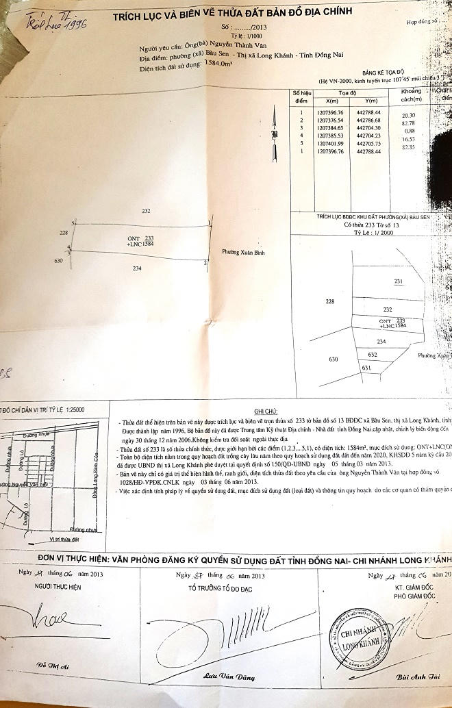 Ông Vân cho rằng có bản đồ địa chính năm 1996 và được cập nhật, chỉnh lý biến động năm 2006 nhưng không hiểu tại sao VPĐKQSDĐ Chi nhánh Long Khánh không cung cấp. Bằng chứng ông Vân đưa ra là vào ngày 27/6/2013, khi mới bắt đầu khởi kiện, ông có yêu cầu trích lục bản đồ này và được cung cấp. Trích lục này do ông Bùi Anh Tài, PGĐ VPĐKQSDĐ Chi nhánh Long Khánh ký.
