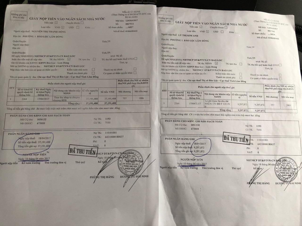 | Giấy nộp thuế của bà Hồng và bà Kim Anh vào ngày 18/04/2017 nhưng Chi nhánh VPĐKĐĐ Bảo Lộc ký cập nhập biến động vào ngày 17/04/2017 |
