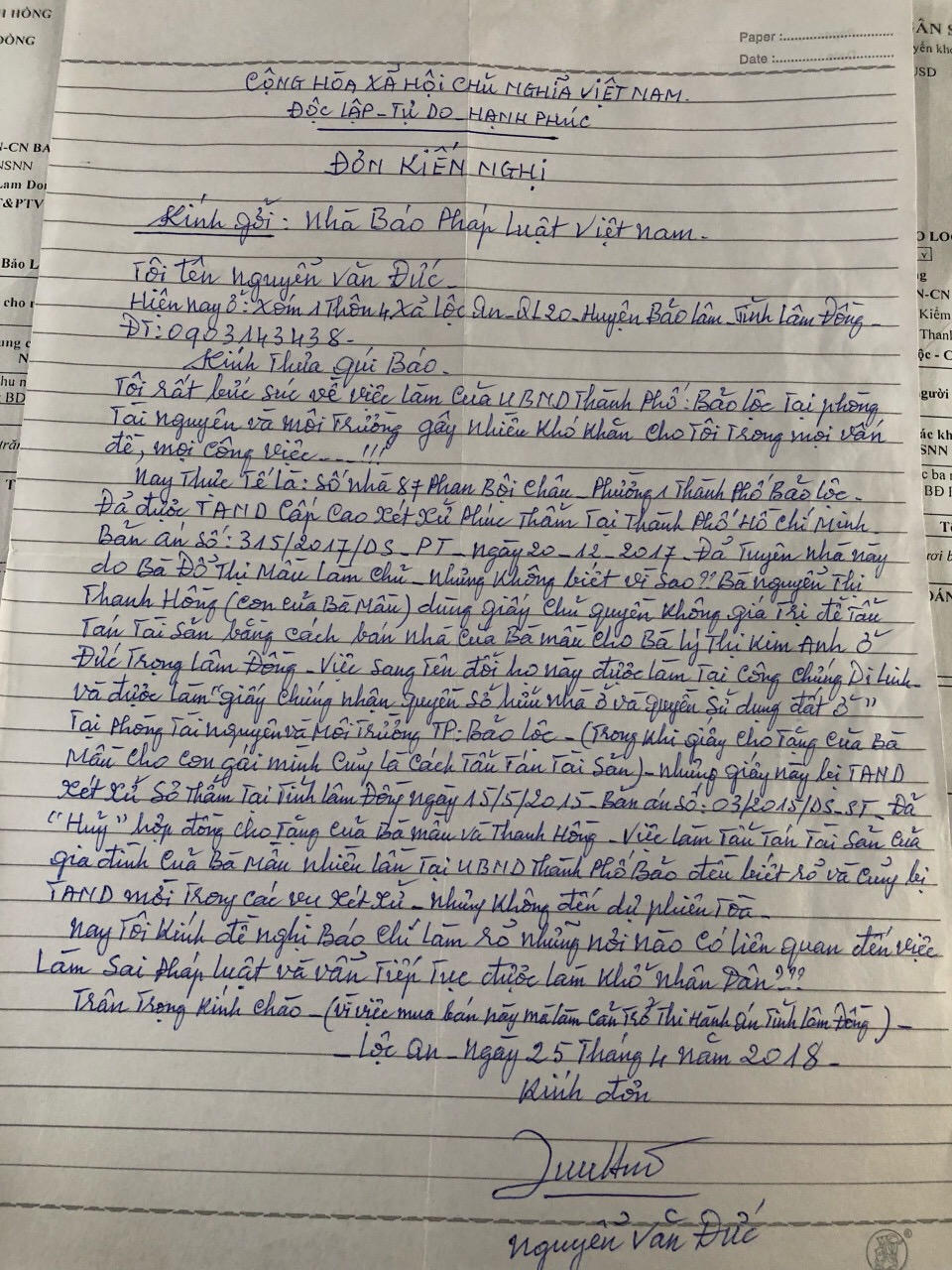 | Đơn gửi Báo PLVN, ông Đức nói rằng việc mua bán giữa bà Hồng và bà Kim Anh là hành vi tẩu tán tài sản |