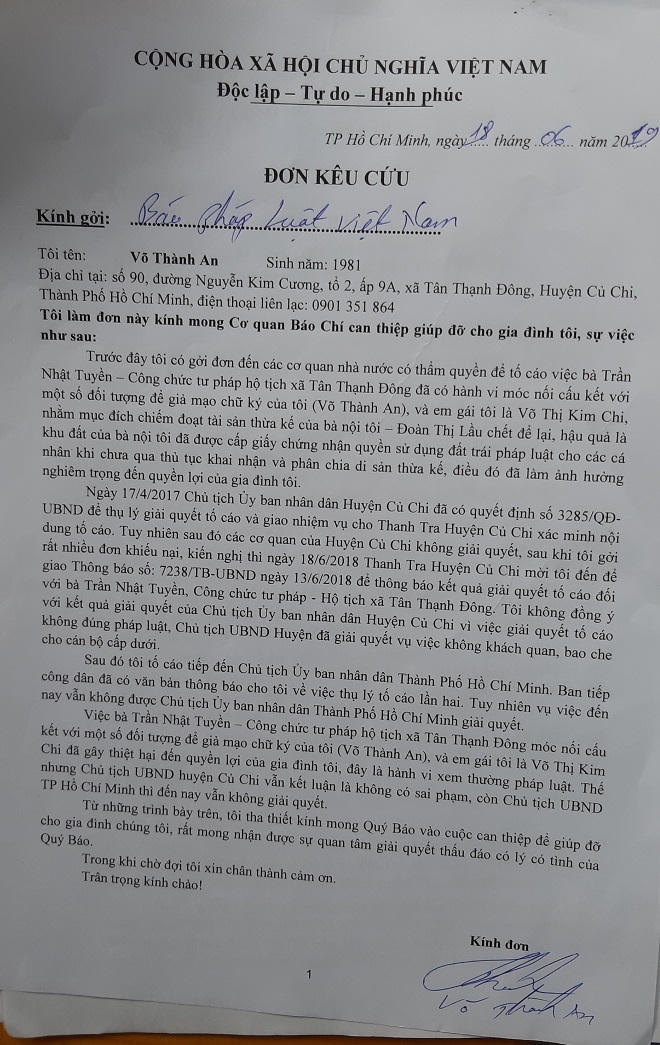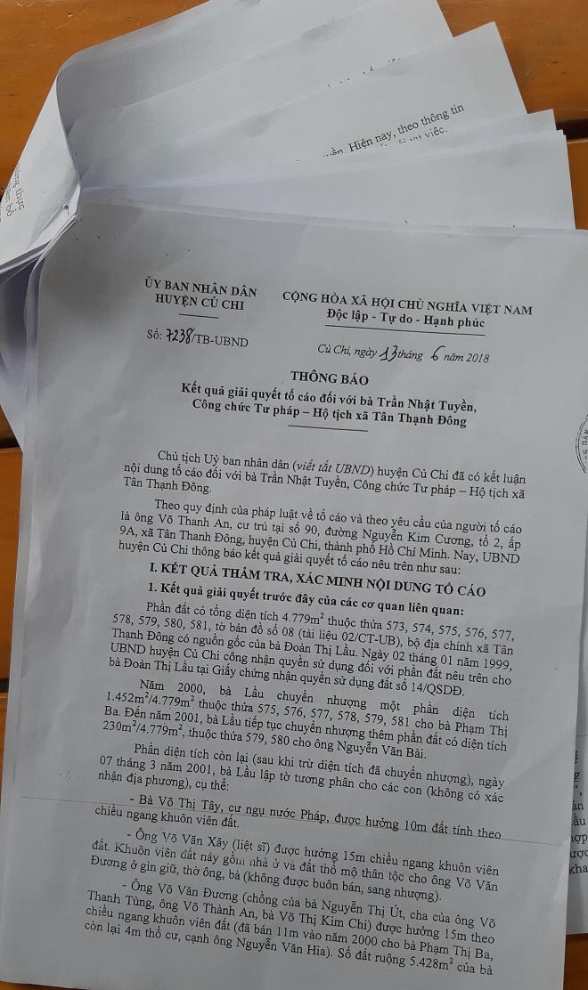 Không đồng ý, anh An tiếp tục tố cáo đến UBND huyện Củ Chi. Ngày 17/4/2017, huyện thụ lý tố cáo và giao Thanh tra huyện giải quyết. Ngày 26/7/2017, Thanh tra huyện trưng cầu giám định chữ ký trên “Giấy cam kết” có chữ ký tên anh An và “Văn bản từ chối nhận tài sản thừa kế” có chữ ký tên chị Chi. Ngày 29/8/2017, Phòng Kỹ thuật Hình sự Công an TP HCM kết luận các văn bản trên giả chữ ký của anh An, chị Chi. Như vậy đã rõ ràng việc Ủy ban nhân dân xã Tân Thạnh Đông bao che sai phạm của các nghi phạm.