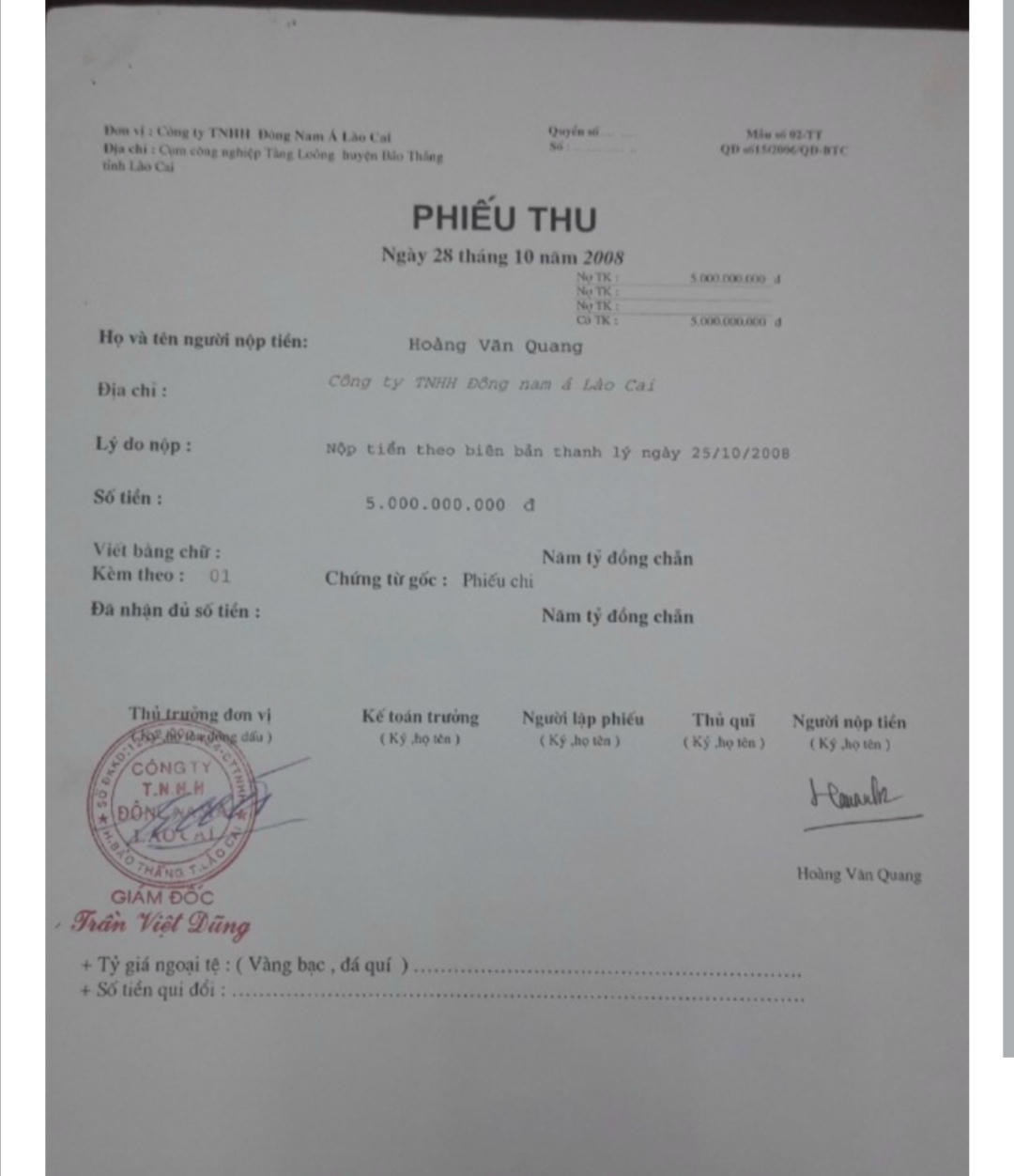 Gần đây nhất, Báo PLVN đã đăng tải bài viết, phản ánh việc ông Quang xác nhận chữ ký vào một phiếu thu 5 tỷ đồng (năm 2008) để chứng minh phần nào trách nhiệm, vai trò của ông Quang đối với hoạt động tài chính kế toán tại Công ty Đông Nam Á là có thực và rất quan trọng. Tuy nhiên, vấn đề này, PLVN sẽ tiếp tục chứng minh ở những bài viết tới, cho thấy vai trò và bóc trần hành vi không trung thực và thoái thác trách nhiệm tại Công ty Đông Nam Á của ông Quang trong vụ việc này.