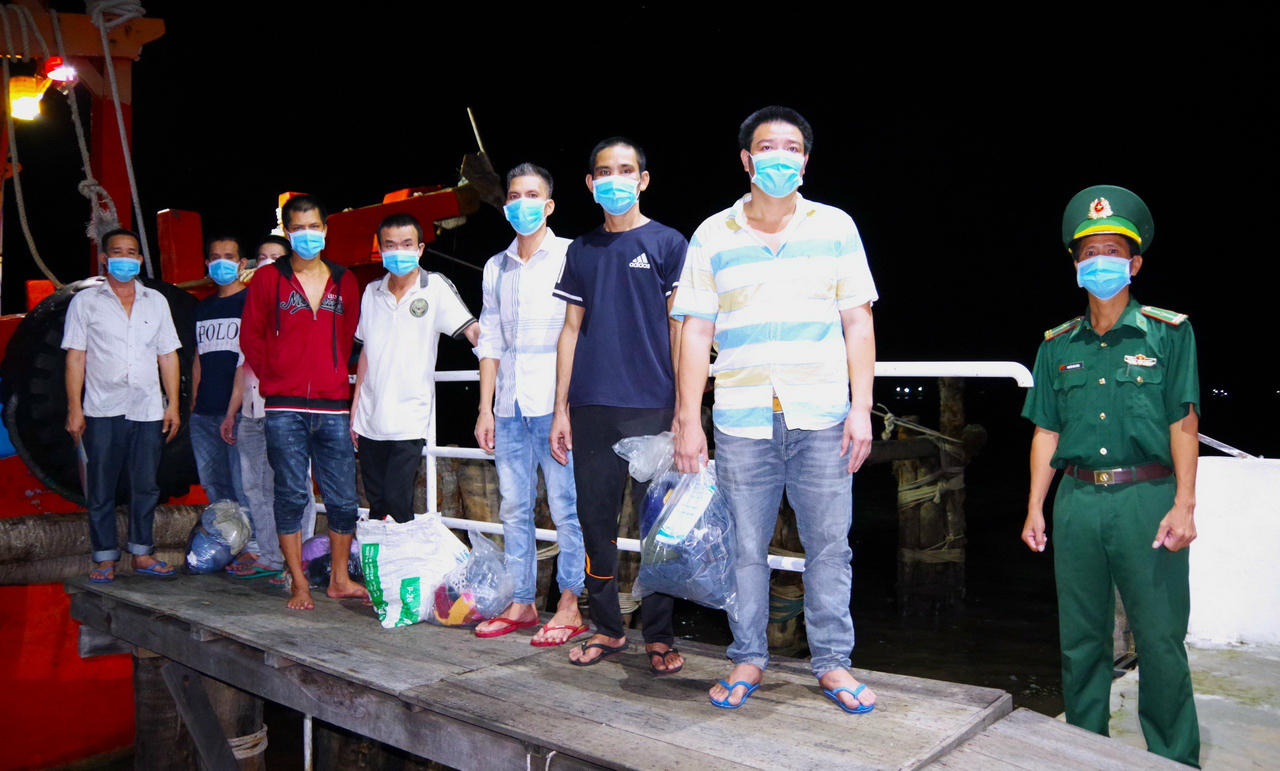 Các thuyền viên chuẩn bị làm các thủ tục để được tiếp nhận tại Trạm kiểm Biên phòng Sông Đốc (huyện Trần Văn Thời, tỉnh Cà Mau). |