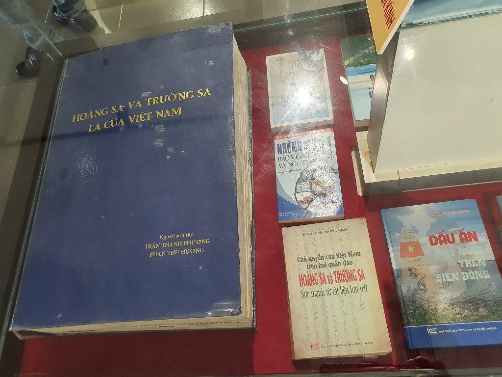 Công trình Nghiên cứu “Những trận chiến bảo vệ Tổ quốc của Thủy quân Việt Nam” do TS. Trần Công Trục, Nguyên Trưởng ban Biên giới Chính phủ tặng. Đây là bản thảo công trình nghiên cứu của cá nhân ông gửi tặng Thư viện Hoàng Sa để phục vụ độc giả tham khảo; Tác phẩm “Trường Sa Đông”, các bức ký họa về Trường Sa và tranh cổ động về tuyên truyền chủ quyền biển đảo do họa sĩ Hồ Đình Nam Kha, Chủ tịch Hội Mỹ thuật TP. Đà Nẵng trao tặng; Bản đồ Tourane (Đà Nẵng) được Sở Địa dư Đông Dương phát hành vào tháng 11/1898, tại Hà Nội.