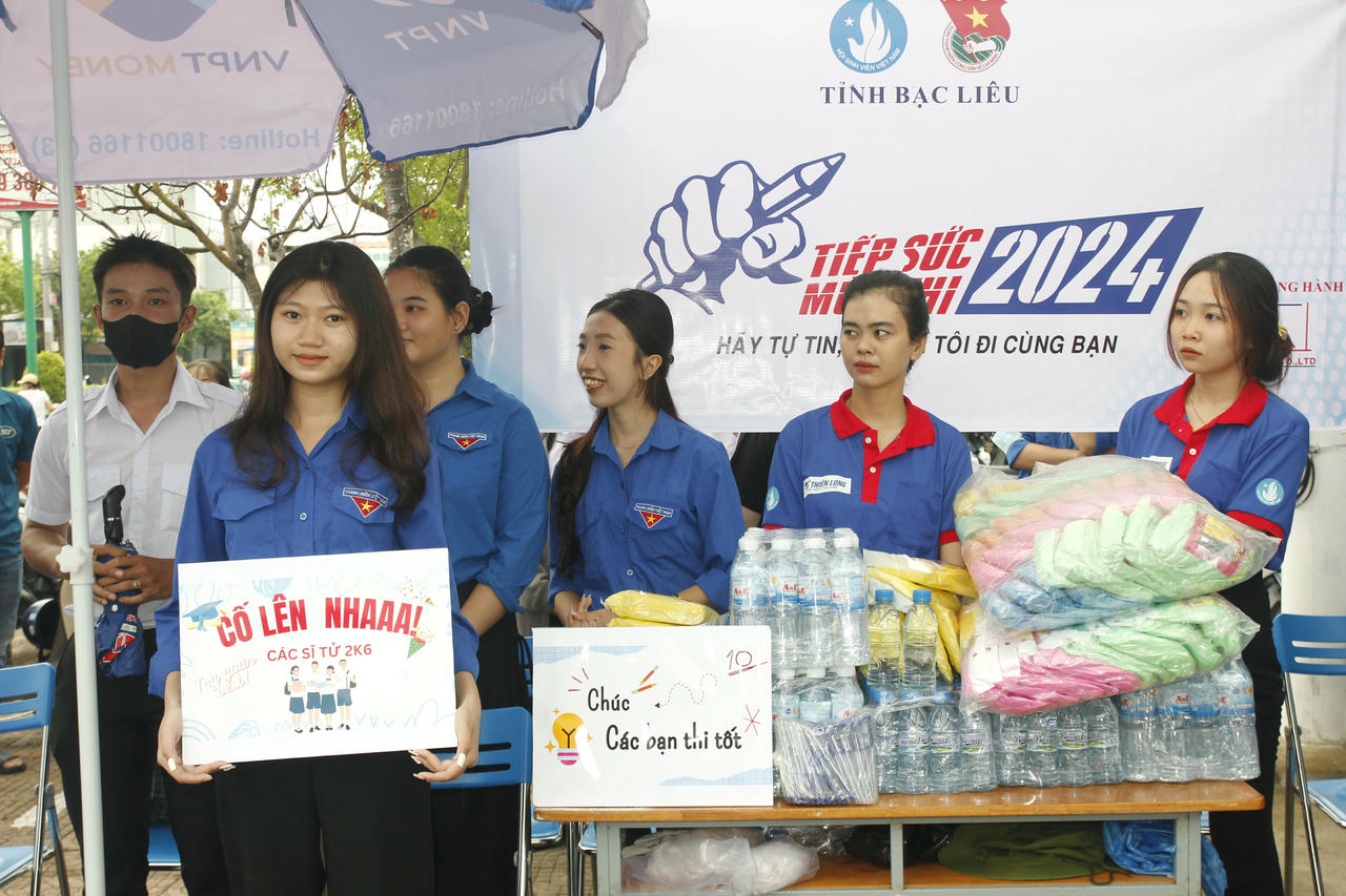 Tại tỉnh Bạc Liêu, sáng nay có 6.413 thí sinh dự thi (trong đó có 5.780 thí sinh lớp 12 giáo dục THPT, 245 thí sinh GDTX và 388 thí sinh tự do), Hội đồng thi bố trí 16 điểm thi với 277 phòng thi đặt tại 7 huyện, thị xã, thành phố trên địa bàn tỉnh. Ngay từ sáng sớm, lực lượng thanh niên tình nguyện tham gia tiếp sức mùa thi tại điểm thi Trường THPT Bạc Liêu, TP. Bạc Liêu. Ảnh: Trọng Nghĩa