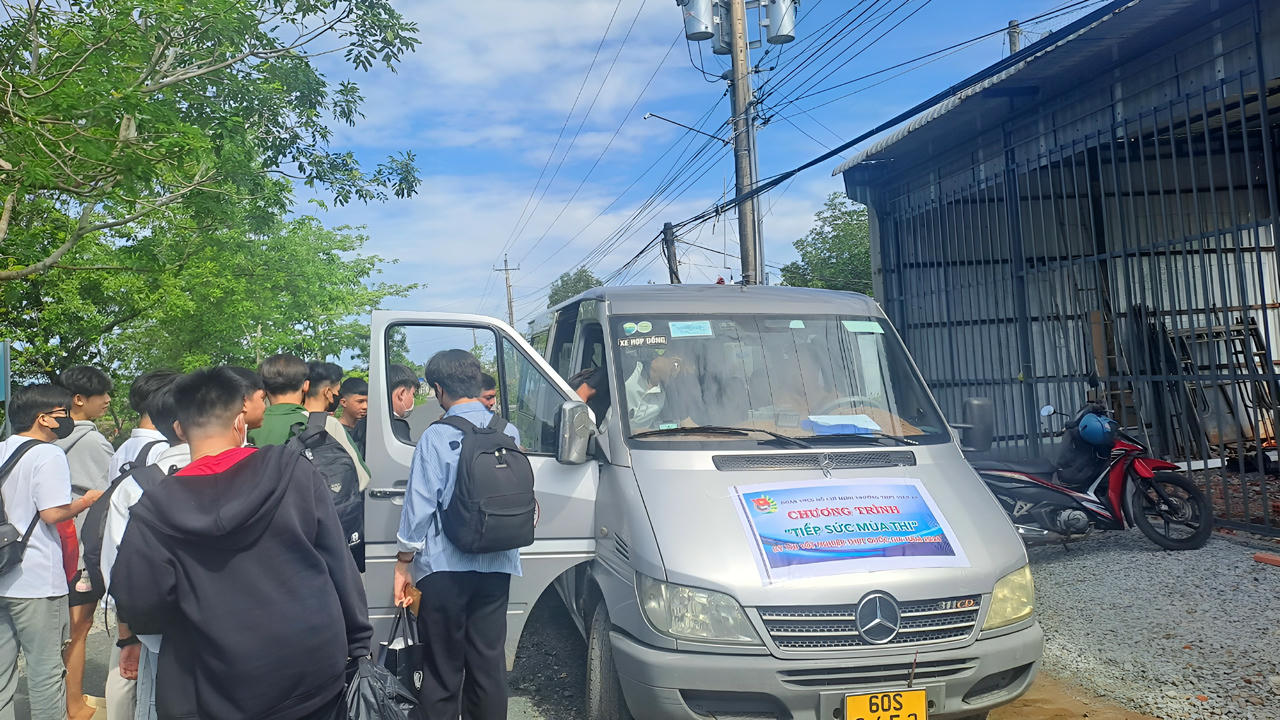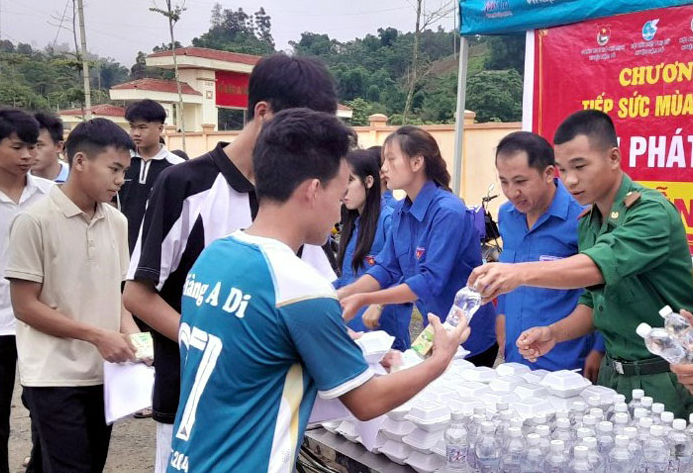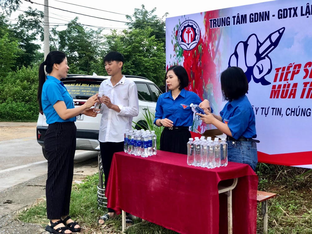 Lực lượng thanh niên tình nguyện tại các điểm thi có mặt từ sáng sớm cổ vũ tinh thần, động viên và chuẩn bị đồ dùng, nước uống hỗ trợ thí sinh. (Ảnh: Báo Quảng Ninh).