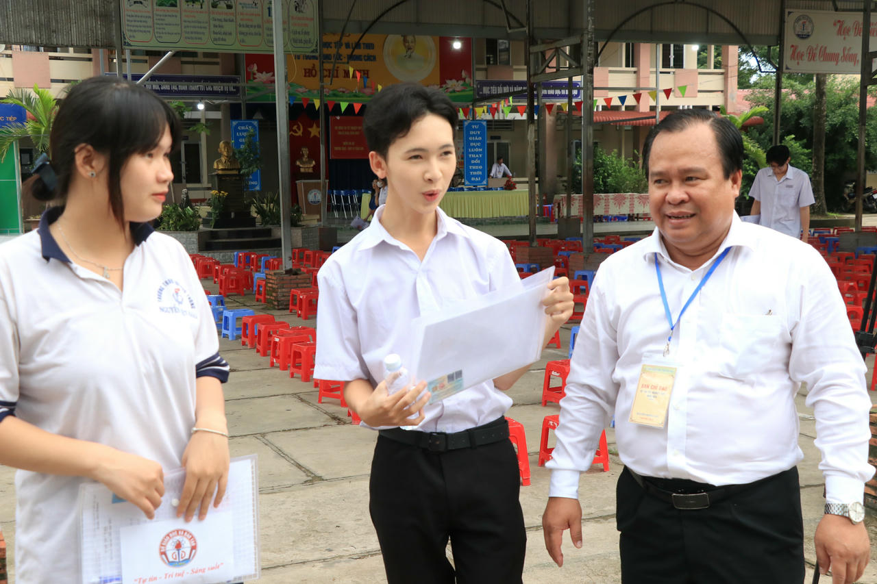 Ông Ngô Vũ Thăng - Phó Chủ tịch UBND tỉnh cùng bà Lâm Thị Sang - Giám đốc Sở GD-ĐT tỉnh, đến động viên, khích lệ các thí sinh tại điểm thi Trường THPT Bạc Liêu, TP Bạc Liêu.
