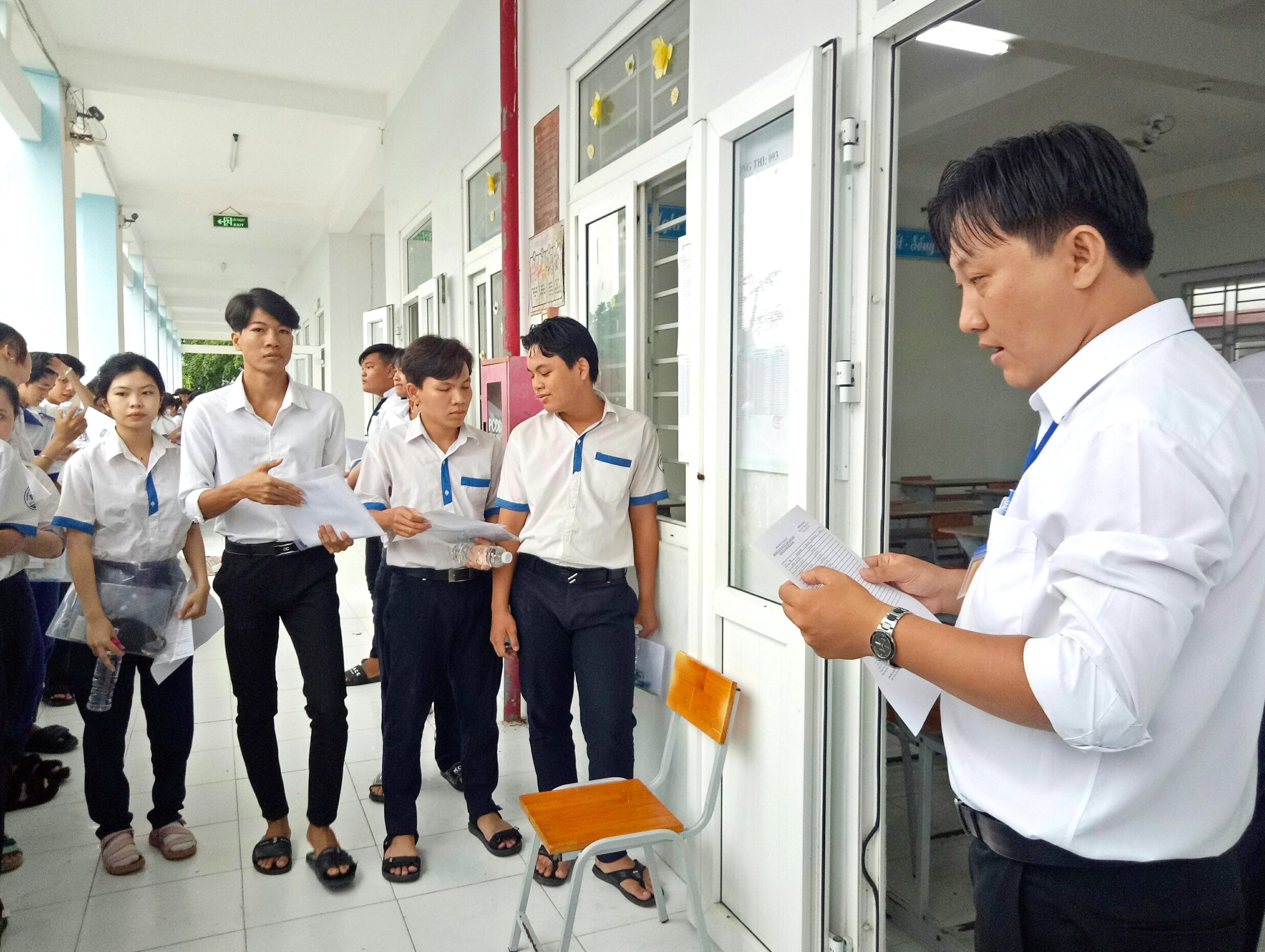Giám thị phát giấy thi, giấy nháp cho các thí sinh. (Ảnh: Báo Quảng Ninh).
