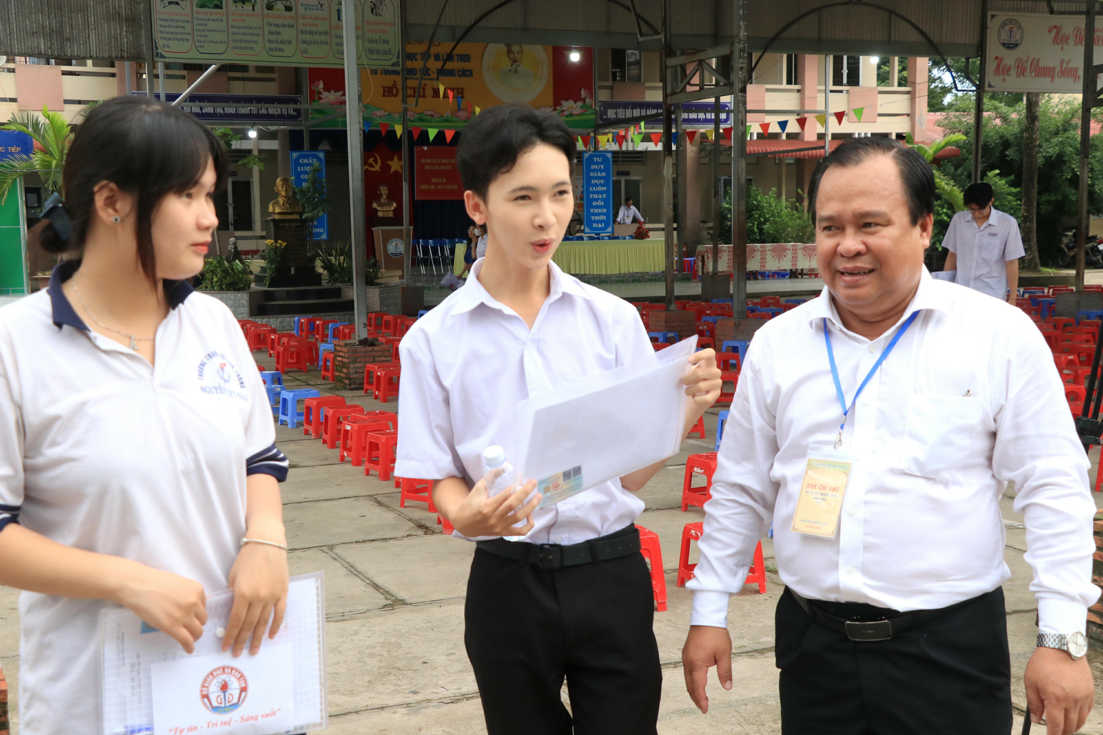 Ông Nguyễn Minh Luân - Phó Chủ tịch UBND tỉnh (Trưởng ban chỉ đạo kỳ thi tốt nghiệp THPT năm 2024 tỉnh Cà Mau), động viên, thăm hỏi các thí sinh tại điểm thi Trường THCS - THPT Lý Văn Lâm (TP. Cà Mau) trước giờ thi.