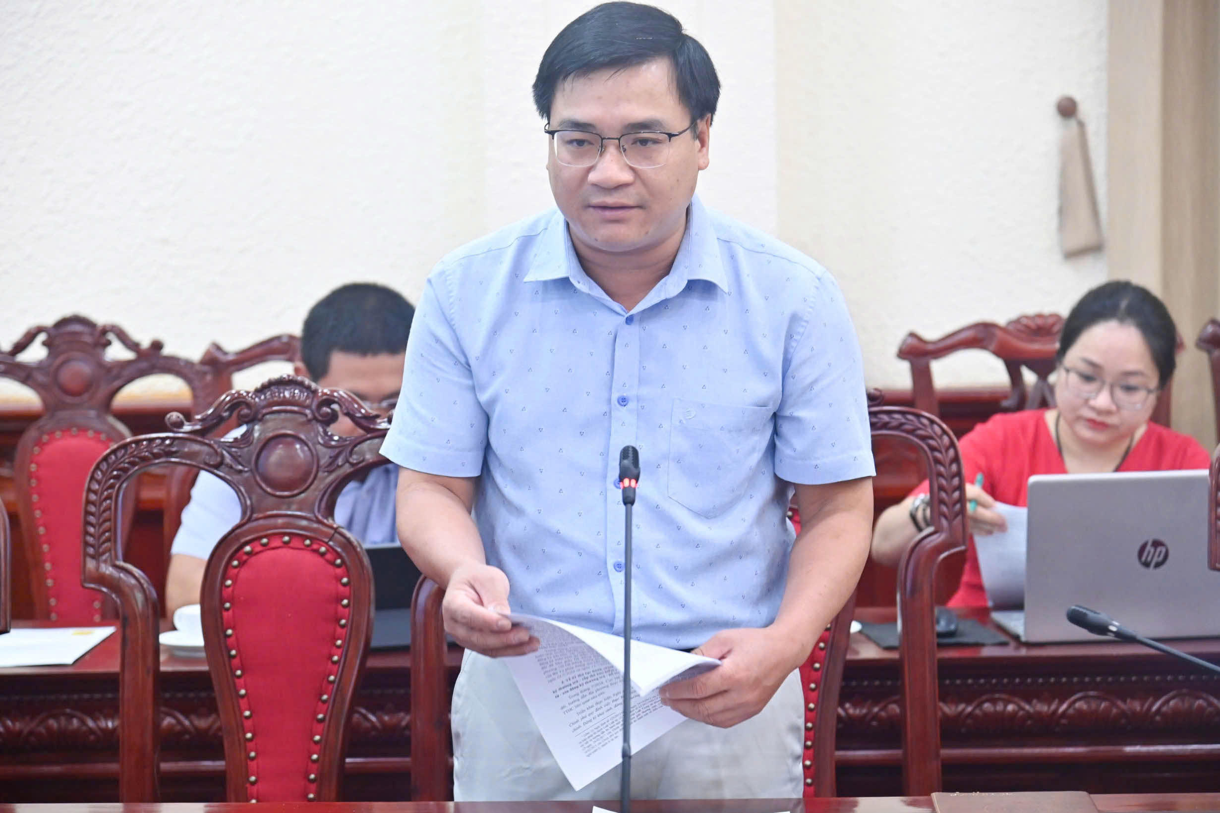 Phó Chánh Văn phòng Bộ Tư pháp Lê Tuấn Phong báo cáo tại cuộc họp. |