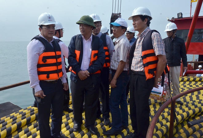 | Chủ tịch EVN Dương Quang Thành (ngoài cùng bên trái) kiểm tra Dự án cấp điện lưới Quốc gia ra đảo Cù Lao Chàm (Quảng Nam) |