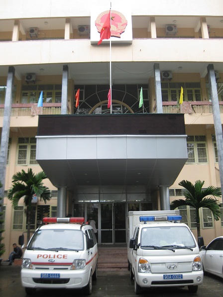 | Xe áp giải Lý Nguyễn Chung và xe cấp cứu trước cổng tòa án. |