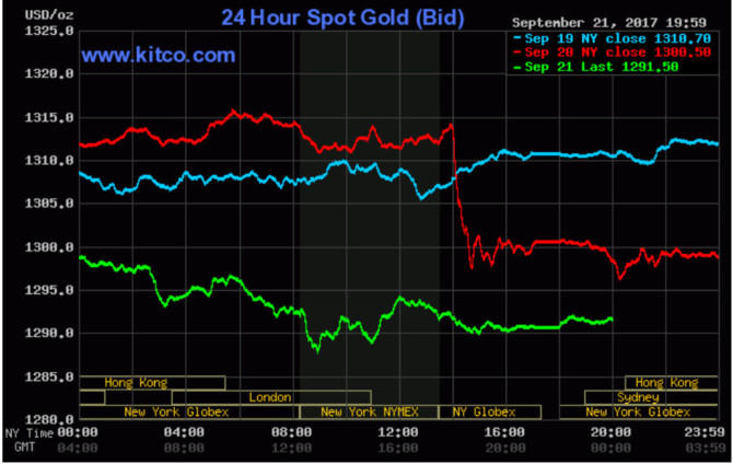 Ở thời điểm cập nhật lúc 7h00 sáng theo giờ Việt Nam, giá vàng giao ngay đang ở mức 1.291,50 USD/ounce, giảm 0,7% so với mức chốt phiên hôm thứ Tư là 1.300,50 USD/ounce.