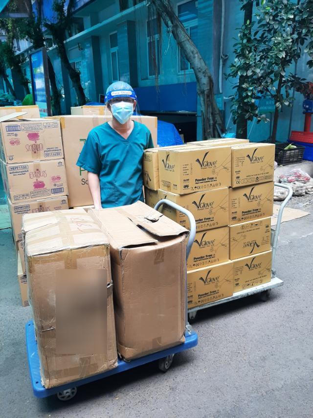 Đại diện bệnh viện dã chiến đang tiếp nhận hàng hỗ trợ. |