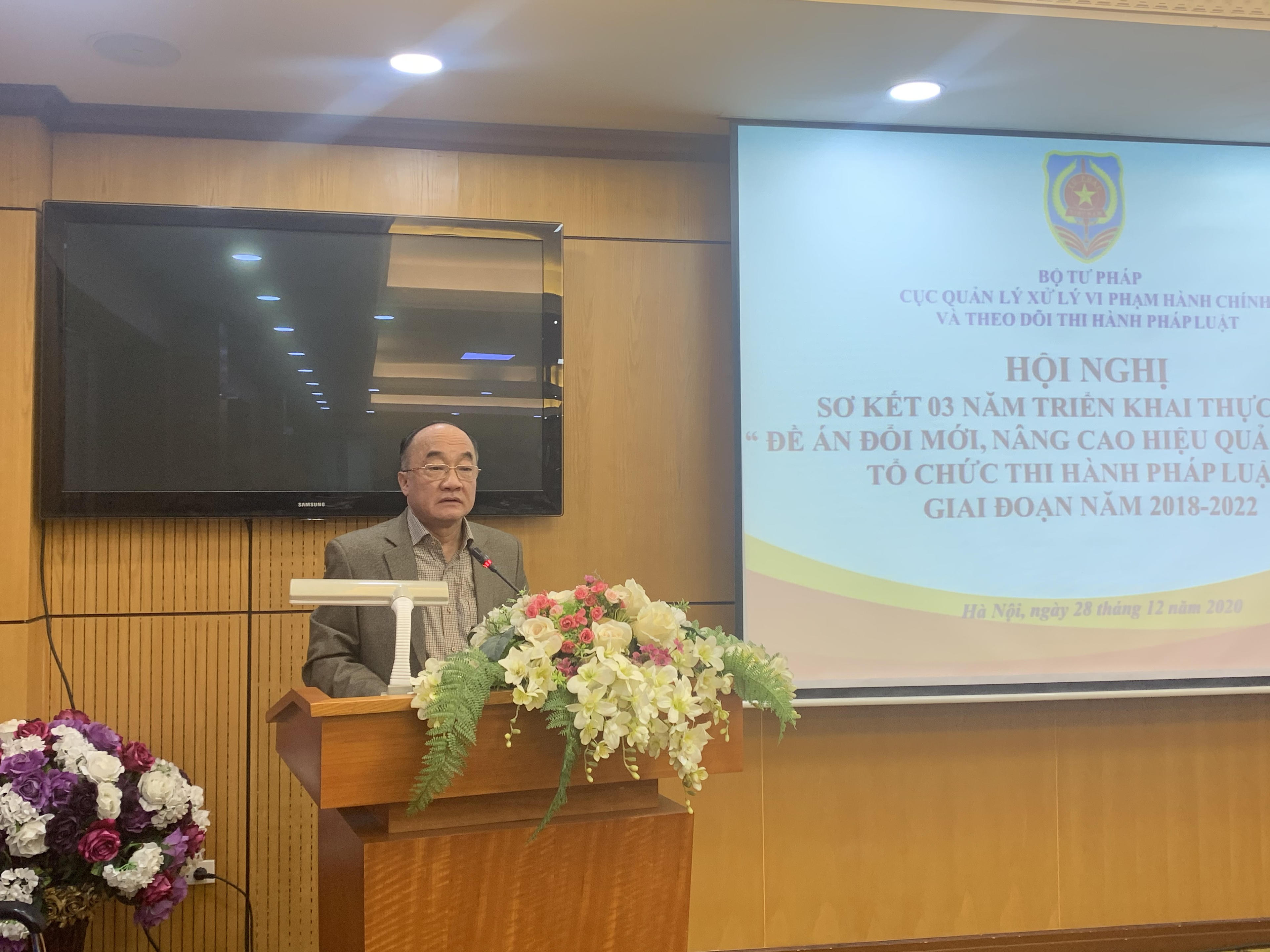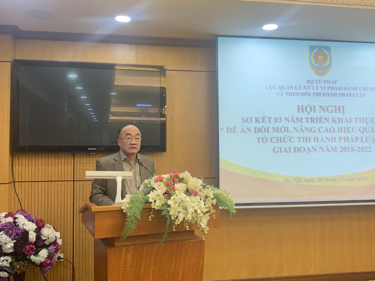 (PLVN) -Chiều 28/12, Bộ Tư pháp đã tổ chức Hội nghị Sơ kết 3 năm triển khai thực hiện “Đề án Đổi mới, nâng cao hiệu quả công tác tổ chức thi hành pháp luật giai đoạn 2018 – 2022” do Cục trưởng Cục Quản lý xử lý vi phạm hành chính và Theo dõi thi hành pháp luật (QLXLVPHC&TDTHPL) Đặng Thanh Sơn chủ trì.