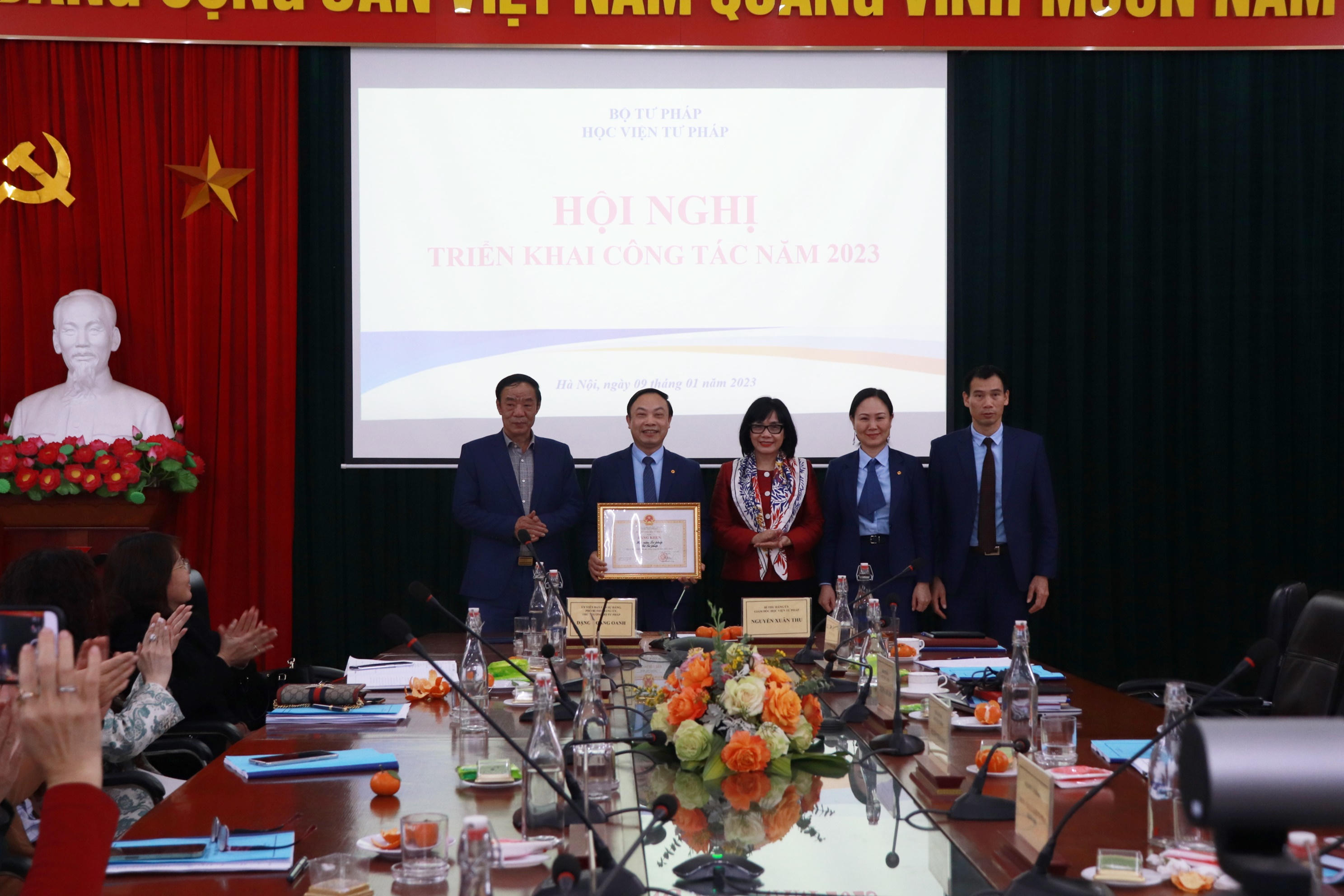 Thứ trưởng Đặng Hoàng Oanh trao Bằng khen của Bộ trưởng Bộ Tư pháp cho tập thể Học viện Tư pháp. |