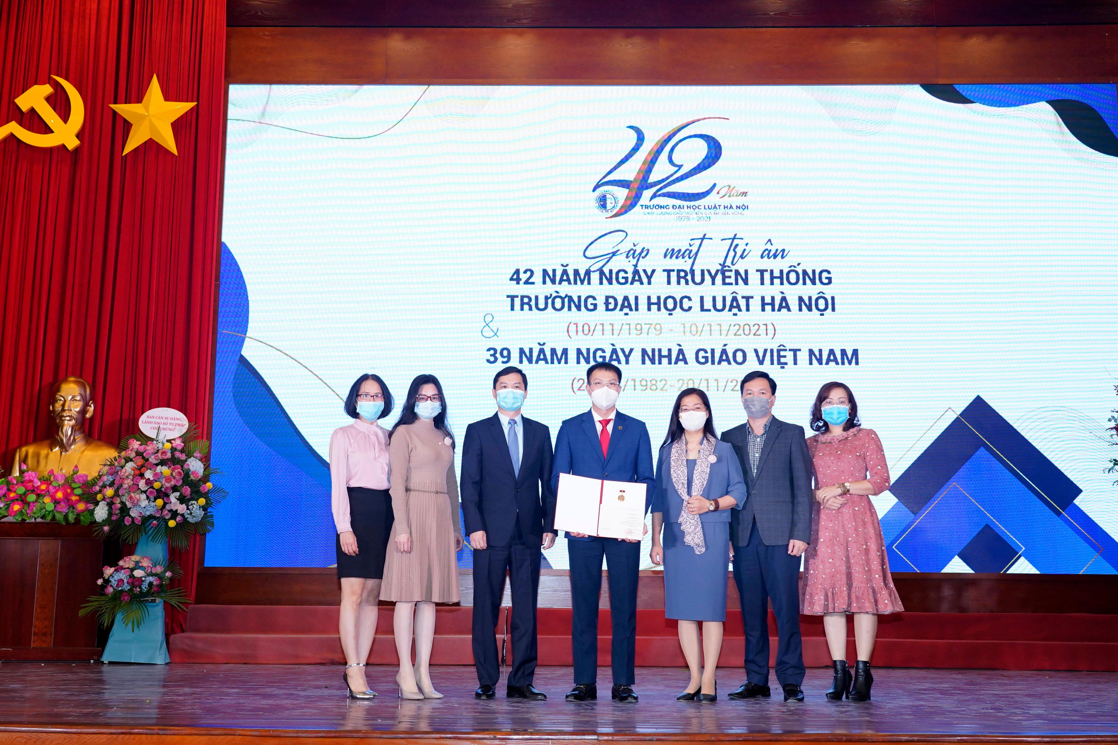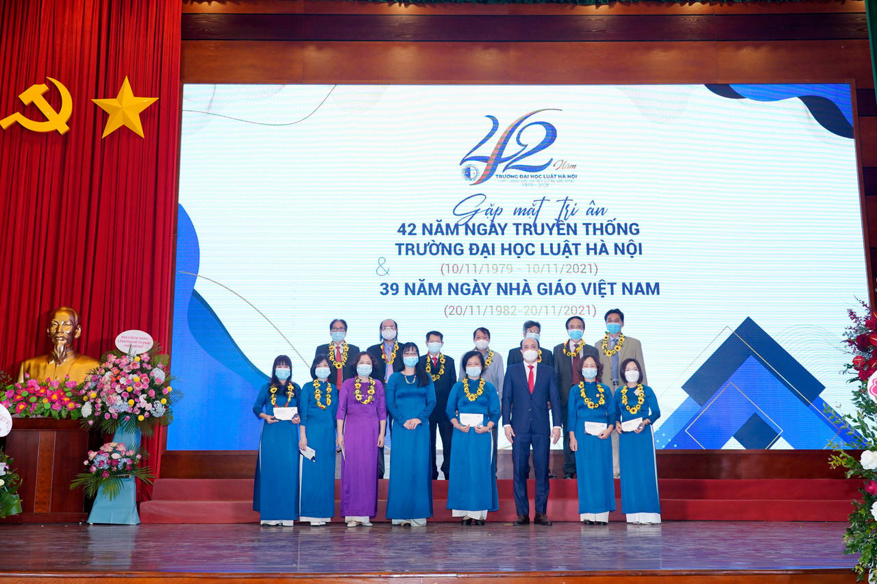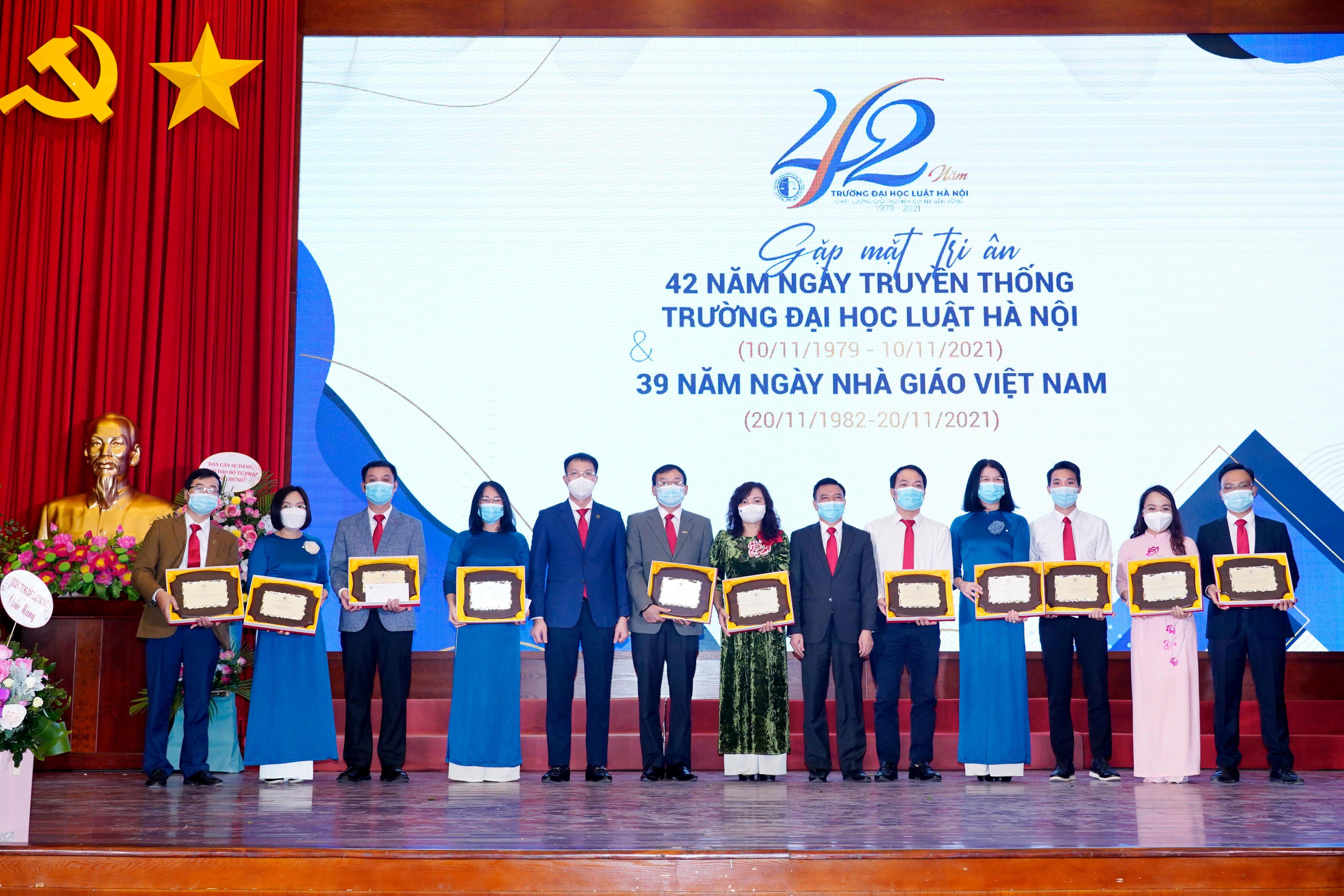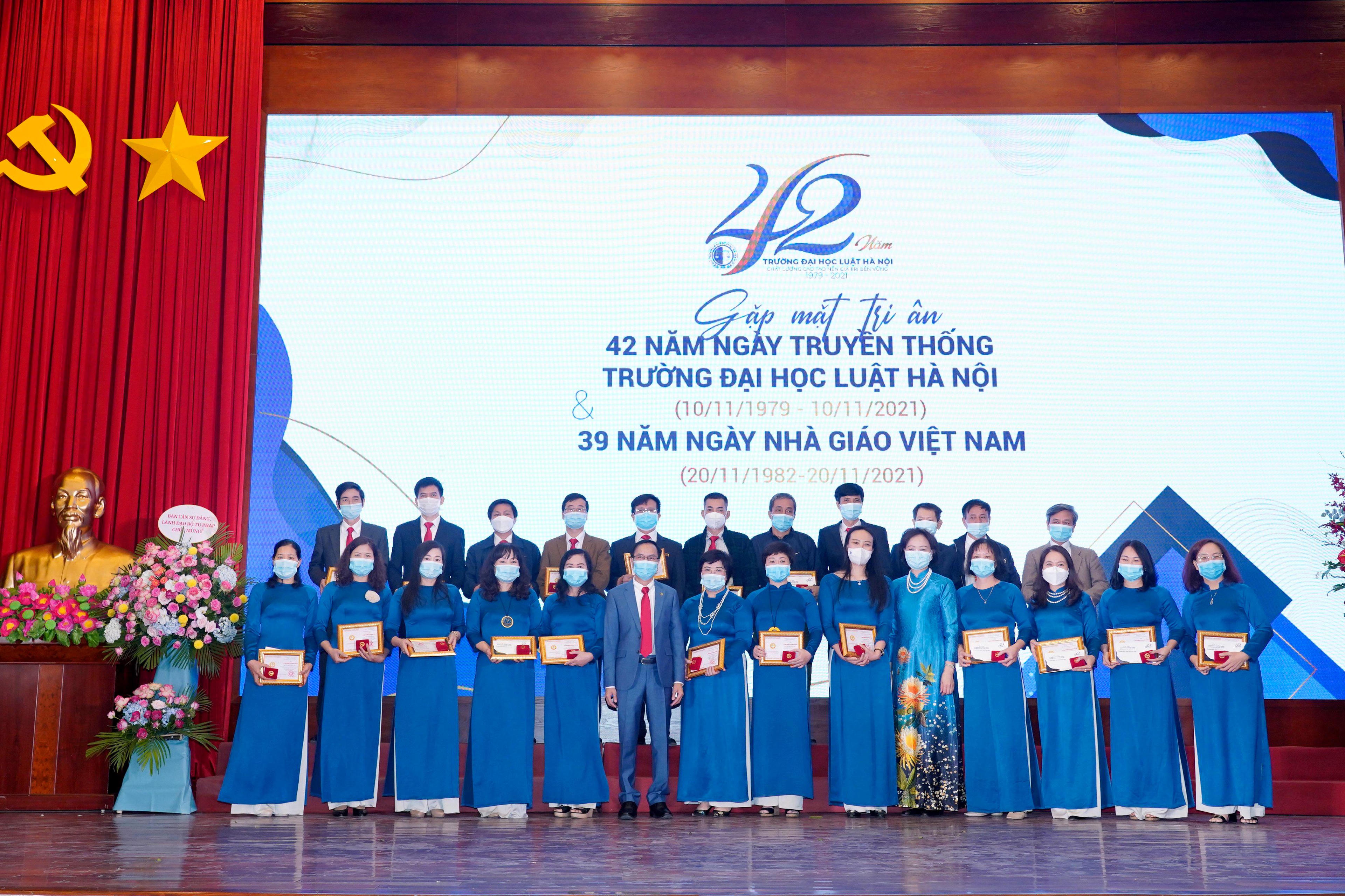Nhân dịp này, Trường Đại học Luật Hà Nội đã tặng hoa cho các nhà giáo ưu tú được Chủ tịch nước phong tặng năm 2021; trao Kỷ niệm chương Vì sự nghiệp tư pháp của Bộ Tư pháp, Kỷ niệm chương Vì sự nghiệp giáo dục của Bộ Giáo dục và Đào tạo năm 2021 và một số kỷ niệm chương khác. Bên cạnh đó, Trường cũng vinh danh các nhà giáo, viên chức, người lao động có nhiều cống hiến cho sự nghiệp đào tạo của nhà trường; vinh danh các nhà giáo, nhà khoa học tiêu biểu trong giai đoạn 5 năm 2016 – 2020 của Nhà trường.