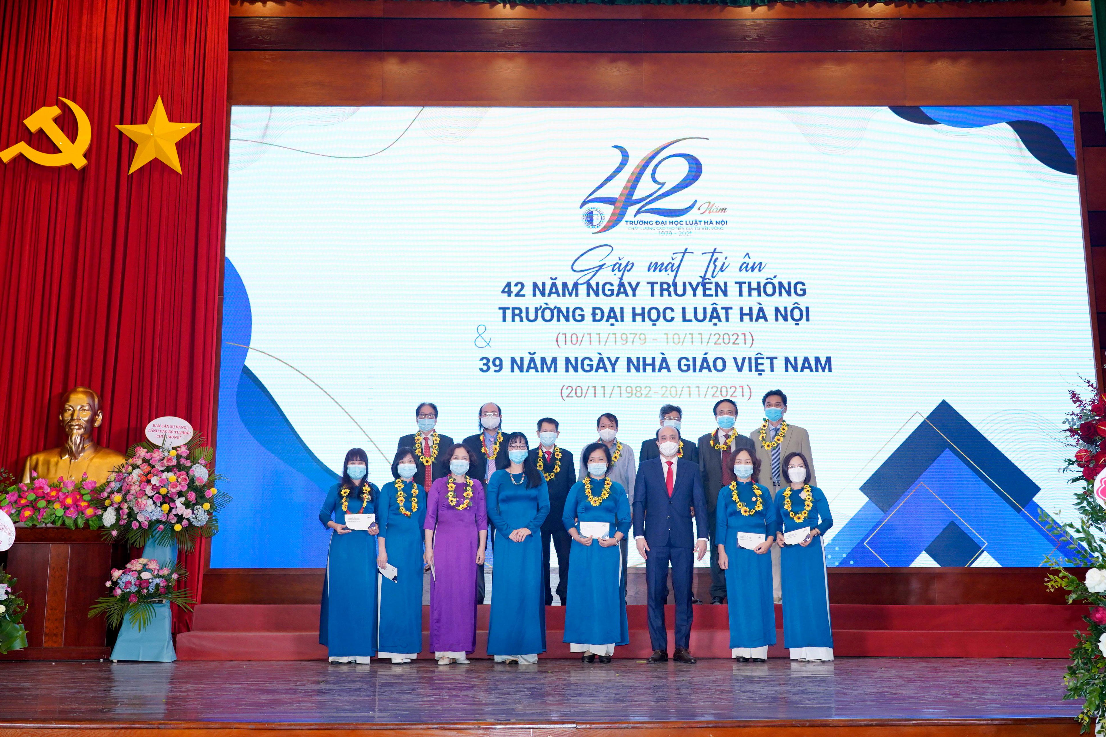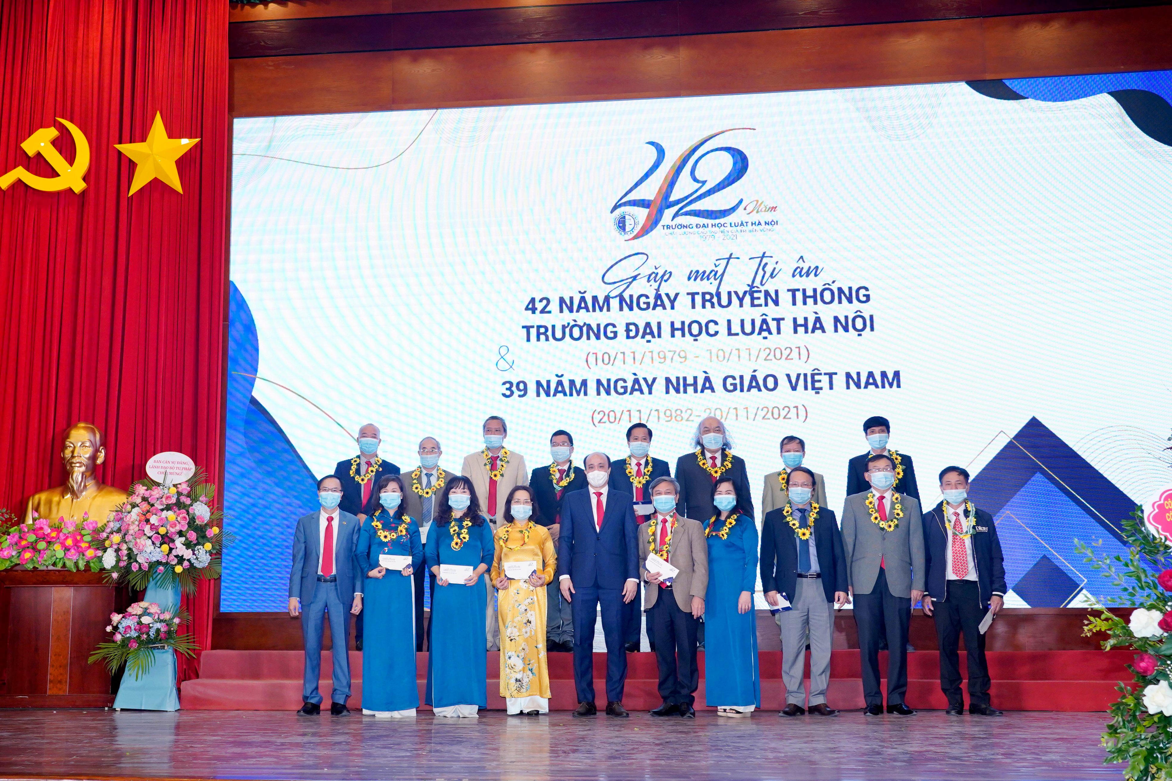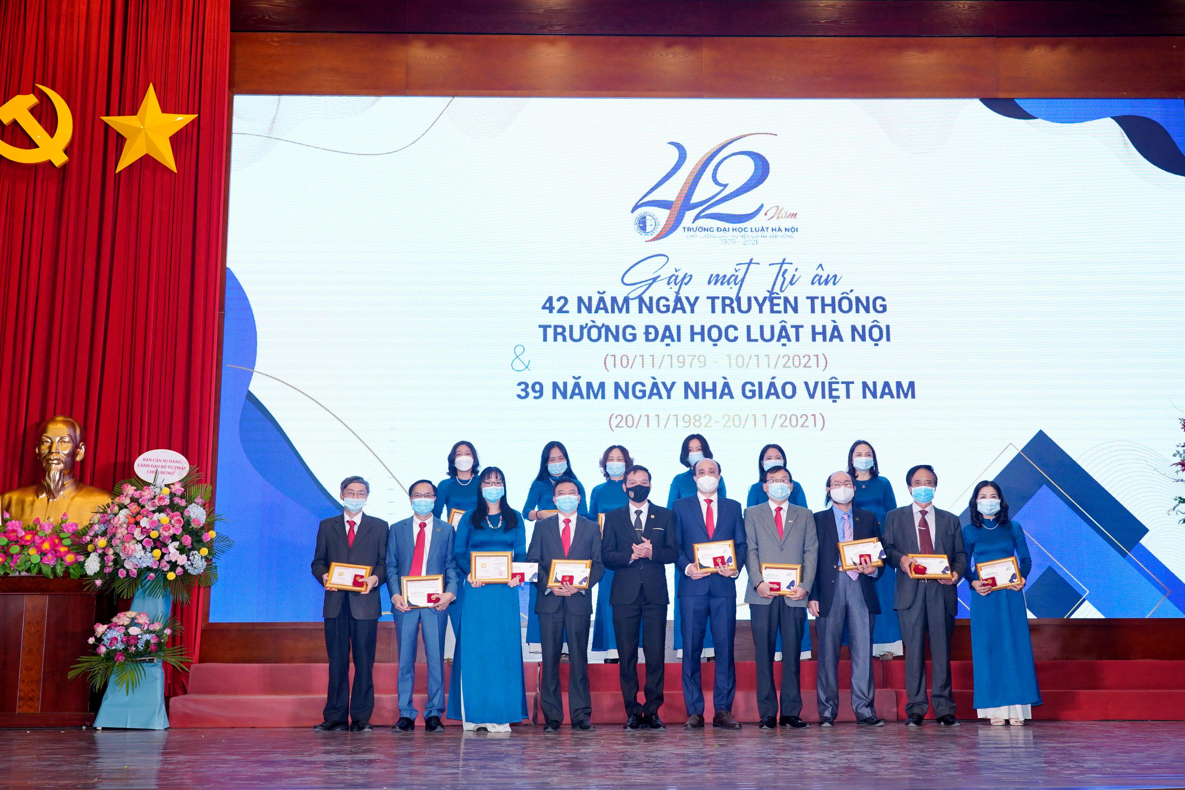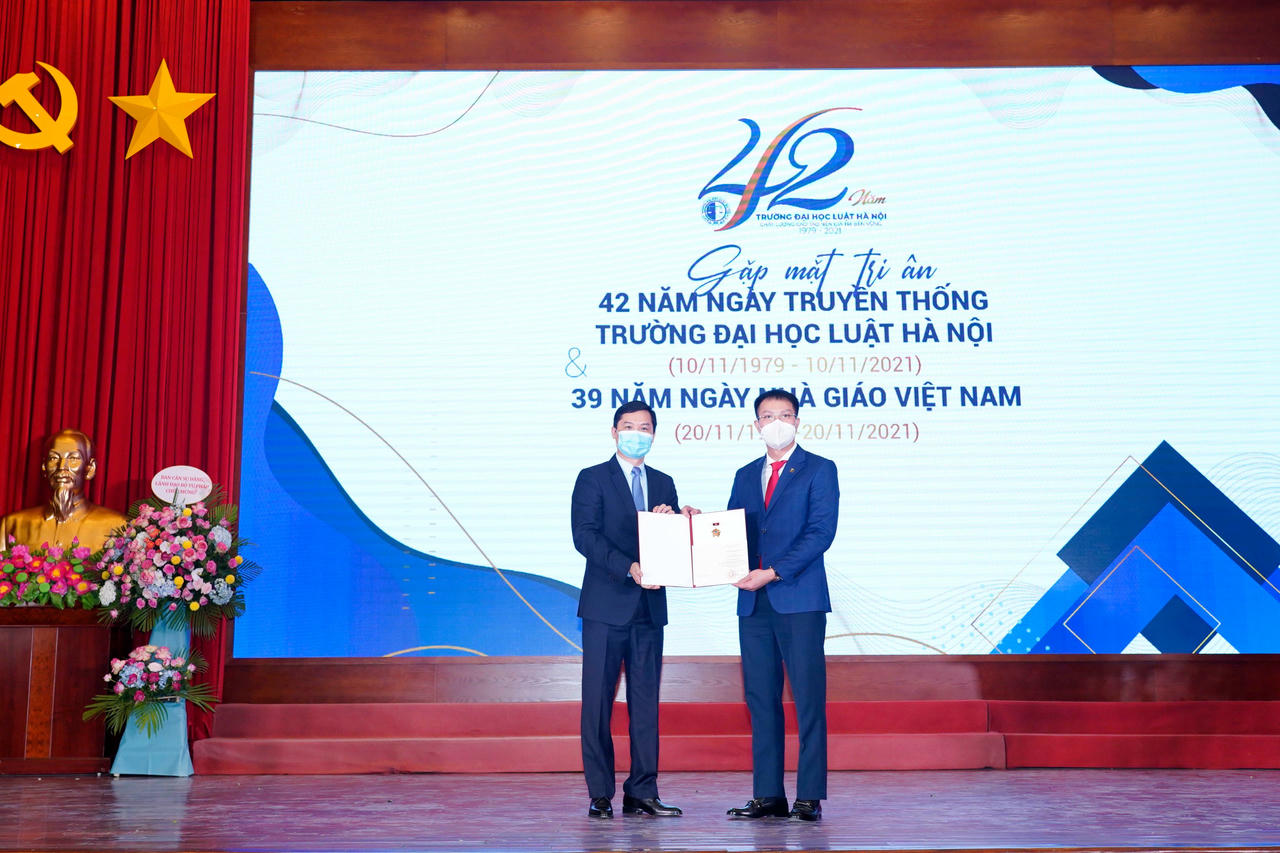 Nhân dịp này, Trường Đại học Luật Hà Nội đã tặng hoa cho các nhà giáo ưu tú được Chủ tịch nước phong tặng năm 2021; trao Kỷ niệm chương Vì sự nghiệp tư pháp của Bộ Tư pháp, Kỷ niệm chương Vì sự nghiệp giáo dục của Bộ Giáo dục và Đào tạo năm 2021 và một số kỷ niệm chương khác. Bên cạnh đó, Trường cũng vinh danh các nhà giáo, viên chức, người lao động có nhiều cống hiến cho sự nghiệp đào tạo của nhà trường; vinh danh các nhà giáo, nhà khoa học tiêu biểu trong giai đoạn 5 năm 2016 – 2020 của Nhà trường.
