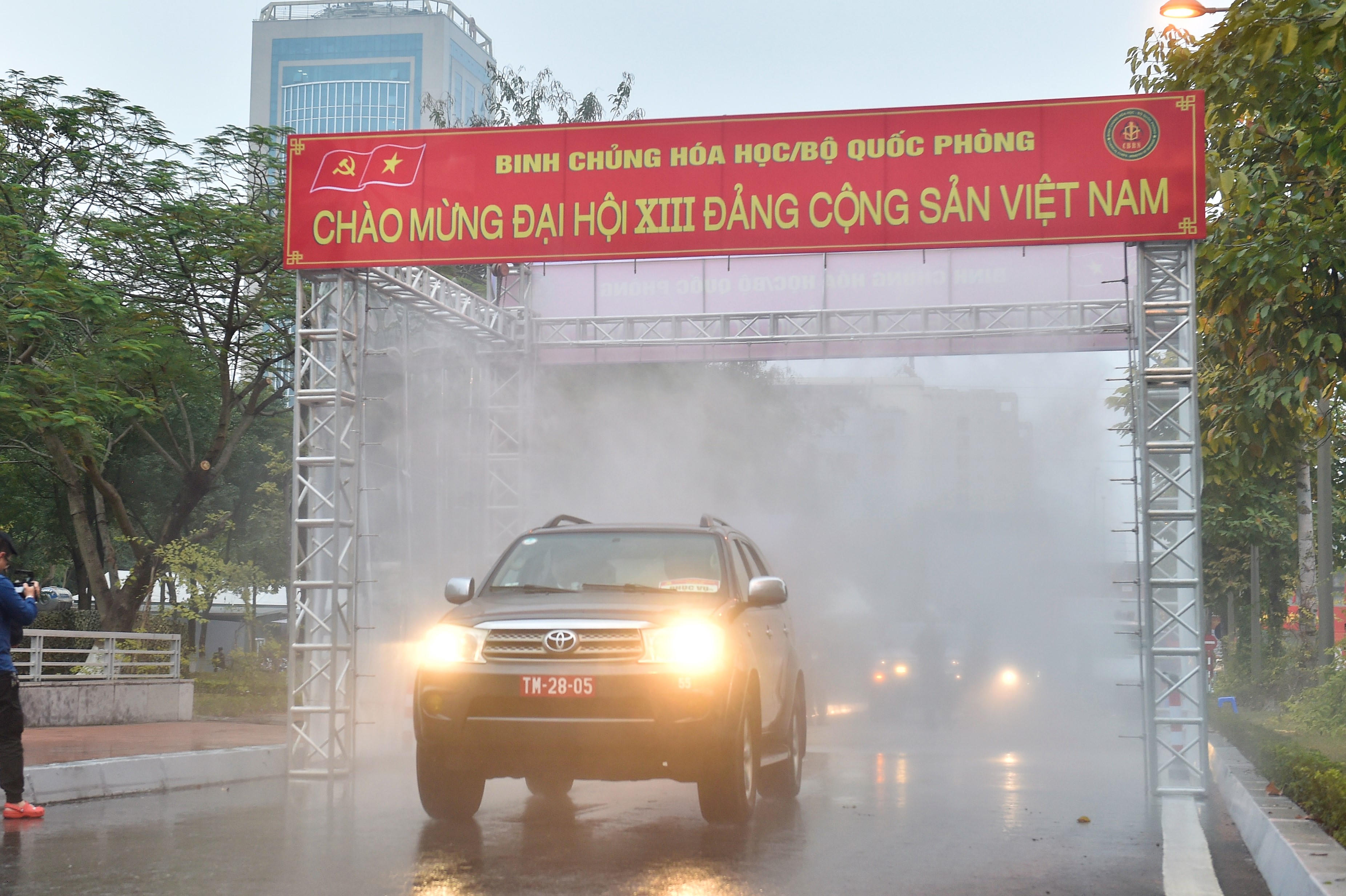 Giàn phun sương khử khuẩn ở các cổng ra vào hoạt động liên tục để khử khuẩn đối với các phương tiện và người ra vào khu vực Đại hội.