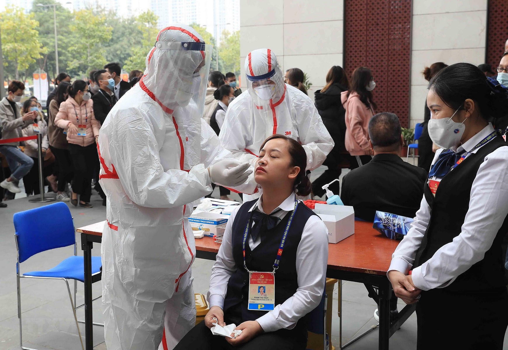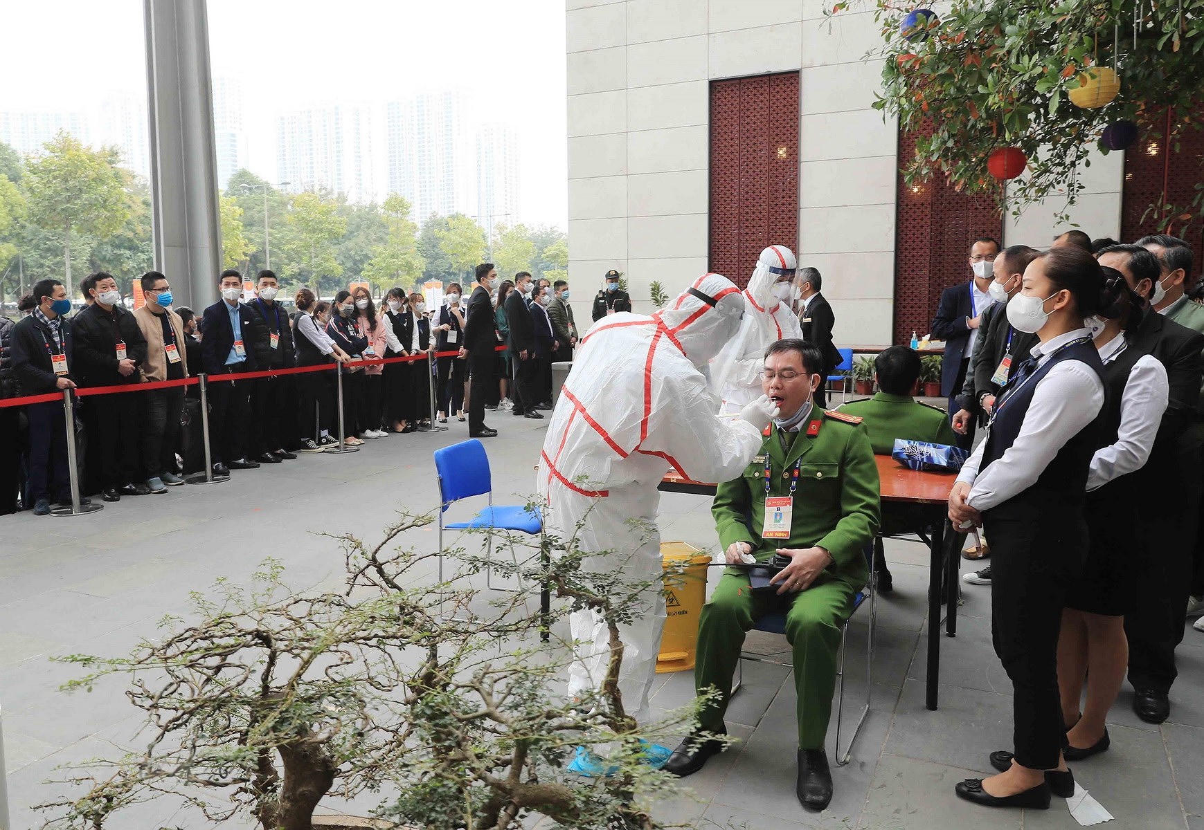 (PLVN) - Ngay sau khi có thông tin về các ca nhiễm Covid-19 trong cộng đồng ở các tỉnh lân cận Hà Nội, Ban Tổ chức Đại hội XIII đã tiến hành xét nghiệm Covid-19 cho toàn thể phóng viên, biên tập viên, kỹ thuật viên tác nghiệp và lực lượng nhân sự phục vụ Đại hội trong ngày 29/1.
