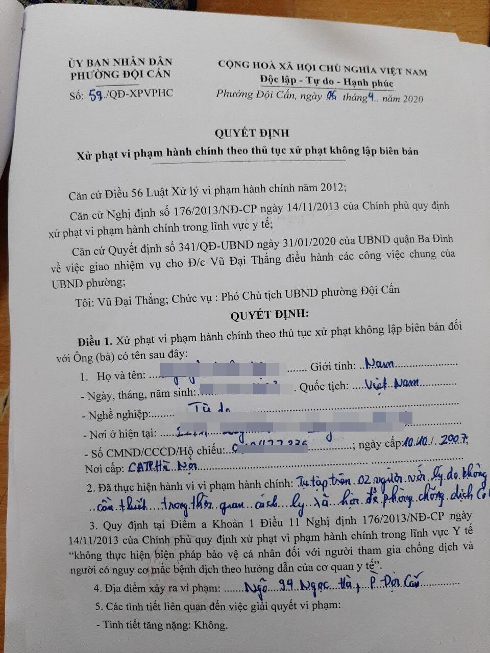 Được biết, địa điểm xảy ra vi phạm 5 trường hợp vi phạm đều tại ngõ 94 Ngọc Hà, Đội Cấn. Biên bản được lập với ly dó đã thực hiện hành vi vi phạm hành chính "tụ tập trên 2 người với lý do không cần thiết trong thời gian cách ly xã hội phòng chống dịch bệnh Covid-19"