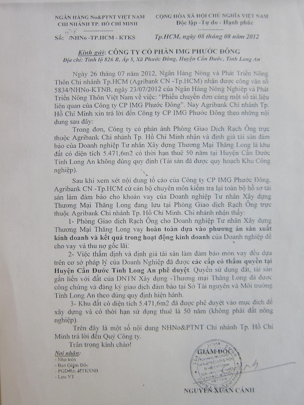 Tiếp nhận đơn khiếu nại của Công ty IMG Phước Đông do Hội sở Agribank chuyển đến, ngày 8/8/2012, Giám đốc Agribank Chi nhánh TP.HCM lúc đó là ông Nguyễn Xuân Cảnh ký văn bản số 598/NHNo-TP.HCM-KTKS, cho rằng: Phòng Giao dịch Rạch Ông cho DNTN Thăng Long vay “hoàn toàn dựa vào phương án sản xuất kinh doanh và kết quả trong hoạt động kinh doanh của doanh nghiệp”. Việc thẩm định và định giá tài sản làm đảm bảo món vay dựa trên cơ sở pháp lý của doanh nghiệp đã được các cấp có thẩm quyền tại huyện Cần Đước phê duyệt…