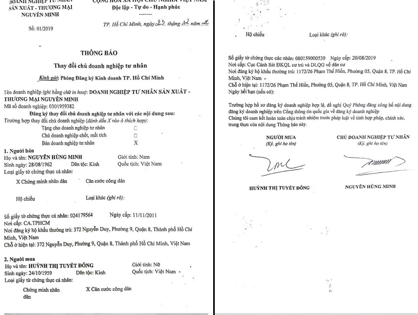 Ông Minh trong tình trạng diễn biến bệnh như trên, nhưng ngày 15/12/2019, xuất hiện chữ ký của ông Minh trong 2 hợp đồng cùng số 01/2019, nội dung bán toàn bộ DN Tư nhân Sản xuất Thương mại Nguyễn Minh (Cty Nguyễn Minh) cho bà Huỳnh Thị Tuyết Đông (SN 1959, bà Đông cũng là người có con chung với ông Minh).