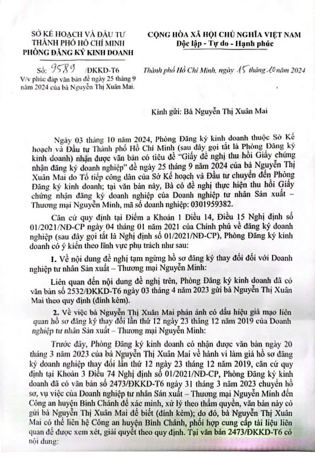 Ngày 31/3/2023, Sở KH&ĐT có Công văn 2473/ĐKKD-T6 chuyển hồ sơ tố cáo của bà Mai đến Công an huyện Bình Chánh đề nghị xác minh, xử lý theo thẩm quyền; và có văn bản kết luận nội dung kê khai trong hồ sơ đăng ký thay đổi lần thứ 12 là giả mạo hoặc không có căn cứ kết luận giả mạo.
