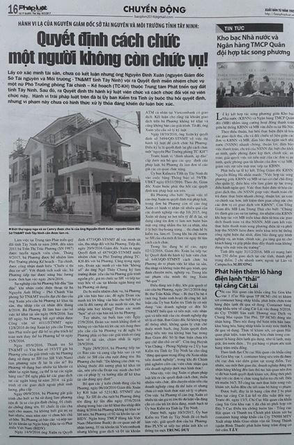(PLO) - Sau khi Báo PLVN có bài phản ánh hành vi kì lạ của ông Nguyễn Đình Xuân - nguyên Giám đốc Sở Tài Nguyên và Môi trường tỉnh Tây ra nhiều quyết định sai quy định pháp luật thì đến ngày 5/5/2017 UBND tỉnh Tây Ninh cũng có công văn số 1135/UBND-NC gửi Ủy ban kiểm tra tinh ủy Tây Ninh xem xét, xử lý việc bà Trần Thị Trúc Phương (SN 1987) khiếu nại, tố cáo ông Nguyễn Đình Xuân.
