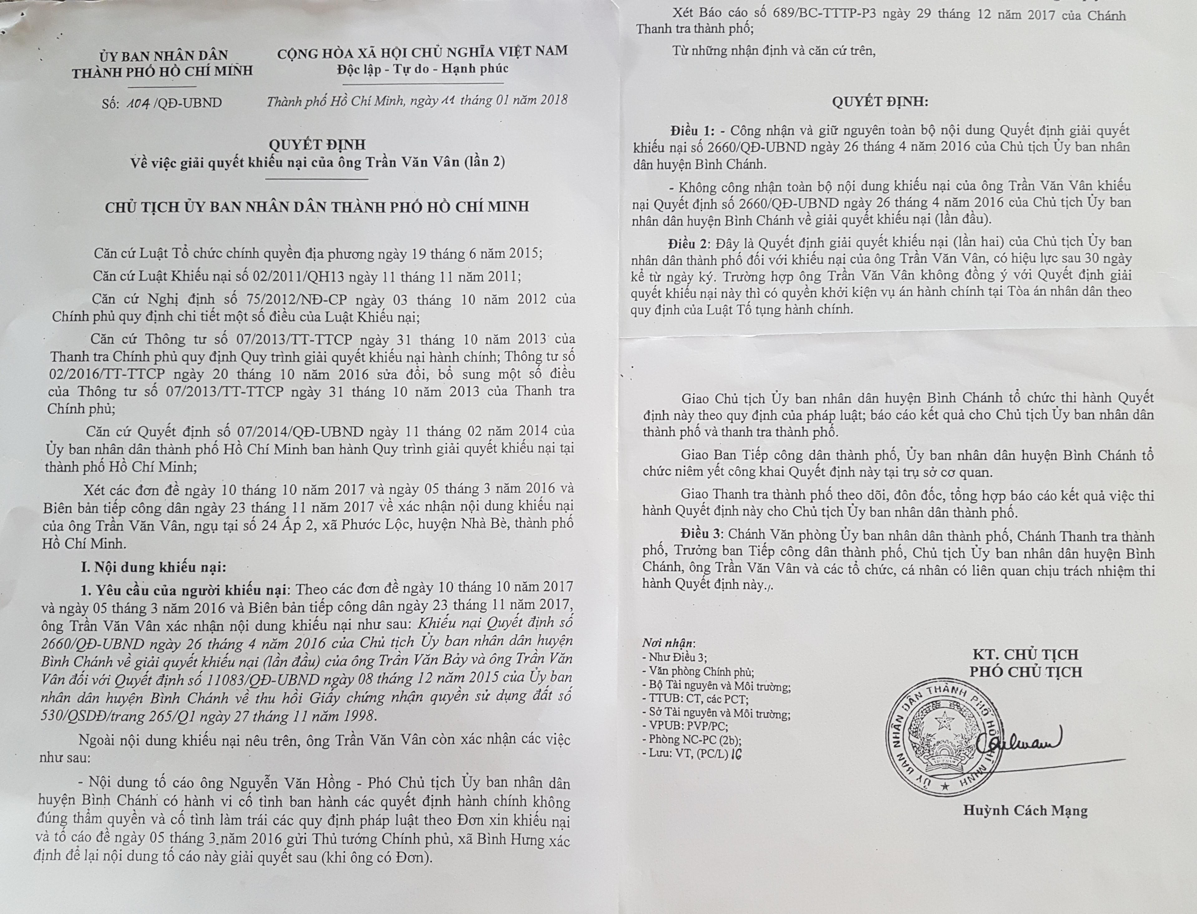 Ngày 11/01/2018, Chủ tịch UBND TP.HCM ban hành QĐ giải quyết khiếu nại (lần 2) số 104/QĐ-UBND, không công nhận toàn bộ nội dung khiếu nại của ông Vân; công nhận và giữ nguyên toàn bộ nội dung QĐ số 2660/QĐ-UBND ngày 26/4/2016 của Chủ tịch UBND huyện Bình Chánh. QĐ số 104 có hiệu lực sau 30 ngày kể từ ngày ký; nếu ông Vân không đồng ý thì có quyền khởi kiện ra tòa vụ án hành chính.