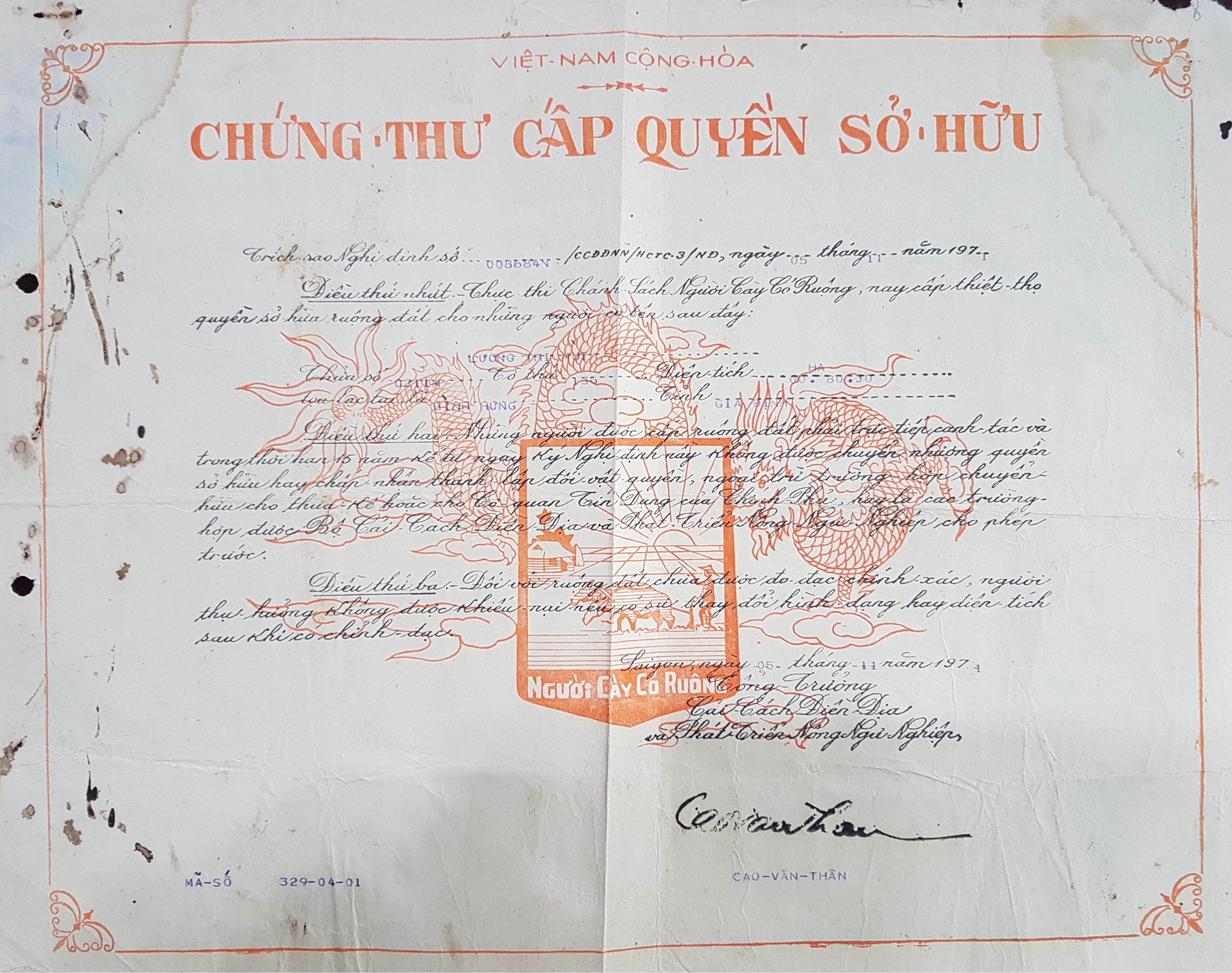 Để ký, ban hành QĐ số 104/QĐ-UBND, Chủ tịch UBND TP.HCM căn cứ vào các tài liệu, chứng cứ đã được các cơ quan chức năng xác minh, thu thập đầy đủ. Theo đó, phần đất 9.793m2 thuộc hai thửa 58 và 59, tờ bản đồ số 15 xã Bình Hưng, huyện Bình Chánh, có nguồn gốc của bà Lương Thị Mùi (SN 1938, mất năm 2005) được chính quyền chế độ cũ cấp “Chứng thư cấp quyền sở hữu” ngày 05/11/1971. Sau năm 1975, gia đình bà Mùi vẫn canh tác phần đất trên. Ngày 13/8/1994, bà Mùi làm đơn xin đăng ký ruộng đất đối với phần diện tích 9.793m2. Đến 4 năm sau, UBND xã Bình Hưng mới căn cứ vào đơn xin này để đưa bà Mùi vào danh sách xét cấp GCNQSDĐ. Căn cứ tờ trình ngày 21/11/1998 của Phòng Địa chính, UBND huyện Bình Chánh đã ra QĐ số 220/QĐ-UB/QLĐT ngày 27/11/1998 cấp GCNQSDĐ cho 92 hộ, trong đó có hộ Lương Thị Mùi được cấp GCNQSDĐ số 530/QSDĐ.