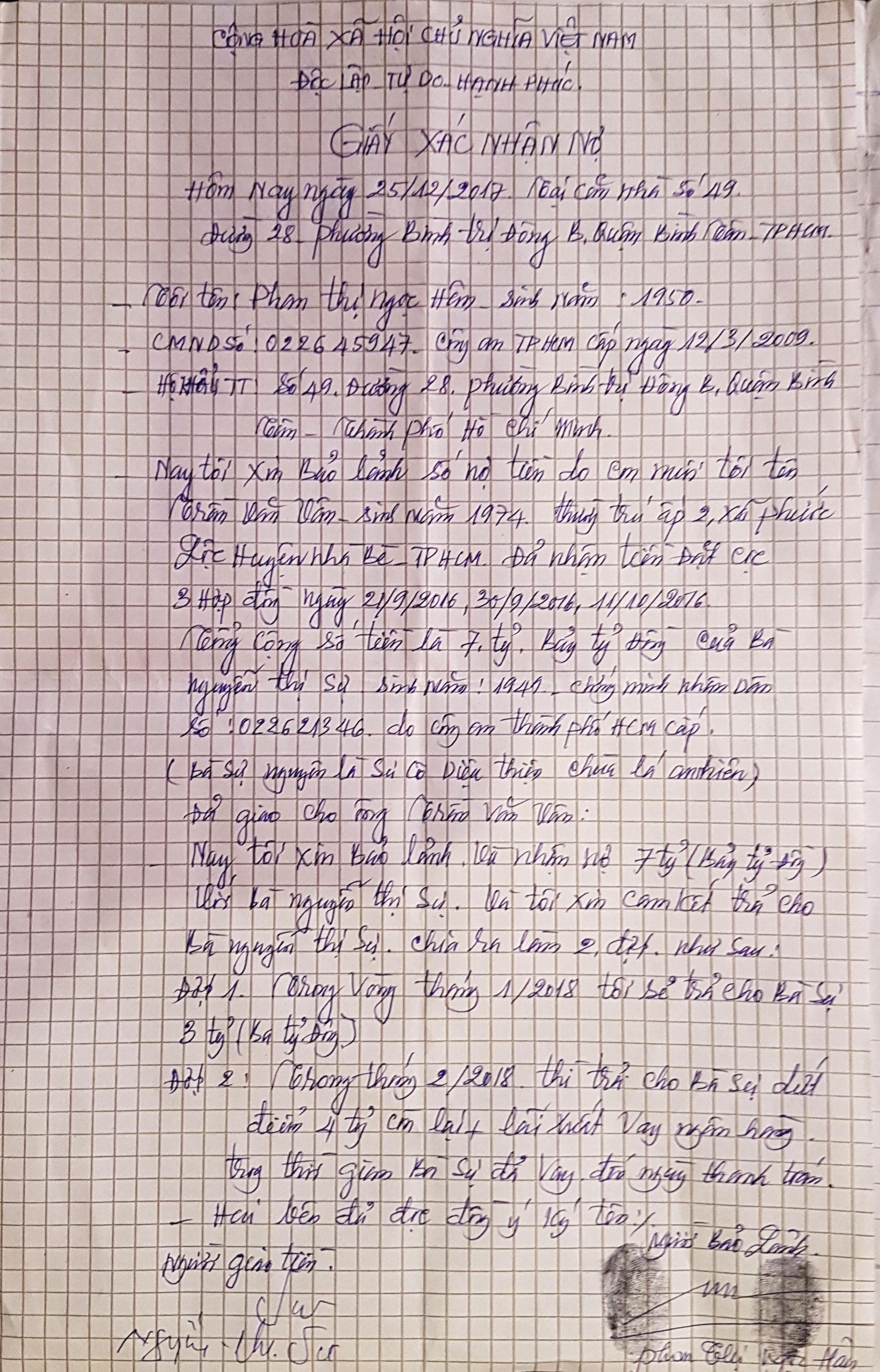 Để tạo sự tin tưởng, ông Vân đưa “mẹ nuôi” tên Phan Thị Ngọc Hân viết thêm tờ cam kết cùng ngày 29/6/2017, ghi rõ:“Tôi Phan Thị Ngọc Hân, SN 1950, thường trú đường 28, phường Bình Trị Đông B, quận Bình Tân, TPHCM, cam kết trả nợ số tiền cọc 7 tỷ đồng. Trong vòng 30 ngày, cô Sự đến nhà tôi nhận tiền hoặc chuyển khoản”. Đến ngày 16/8/2017, người tên Hân ký tên, lăn tay, cam kết lần nữa:“Trong vòng tháng 9/2017 sẽ hoàn tất số tiền của bà Sự, không hẹn lần nào nữa…”.