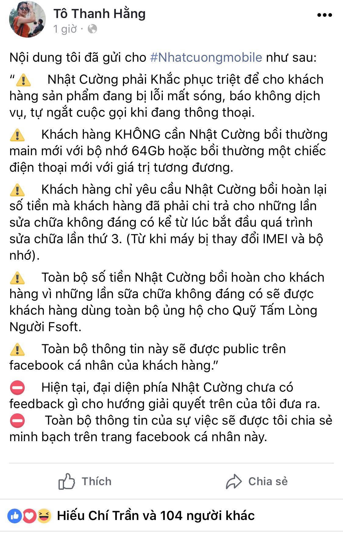 Cập nhật trên trang Facebook cá nhân của chị T.T.H cũng đăng tải một số thông tin về sự việc trên.Theo đó, Chị.H cho biết phía công ty Nhật Cường Mobile vẫn chưa khắc phục, giải quyết được cho chị, điện thoại chị vẫn trong tình trạng mất dịch vụ hoặc tự ngắt khi đàm thoại. Chị.H cũng cho biết thêm, chị chỉ cần phía công ty Nhật Cường Mobile hoàn trả lại số tiền mà kĩ thuật viên đã sửa chữa từ lần thứ 3 trở đi ( từ khi máy bị thay dổi imei và dung lượng). Mọi số tiền khi được Nhật Cường Mobile bồi trả sẽ được chị quyên góp cho Quỹ tấm lòng vàng người Fsoft.